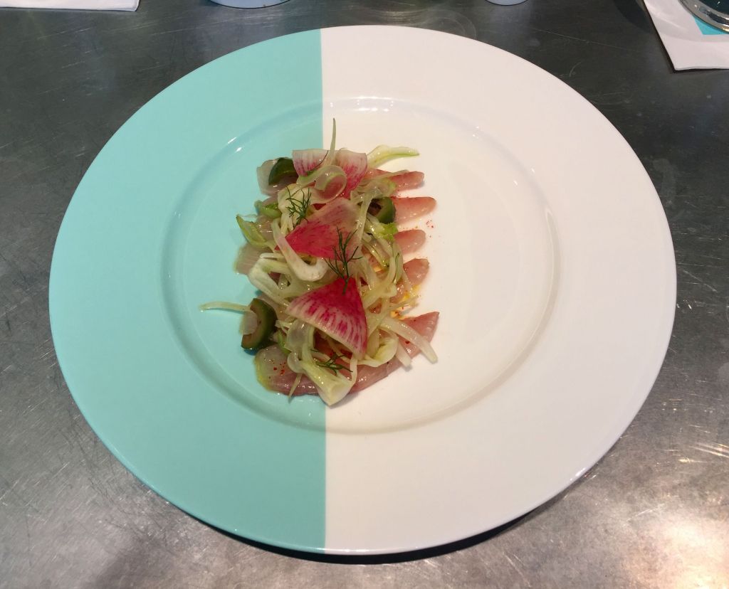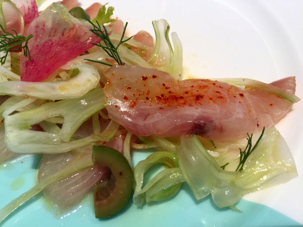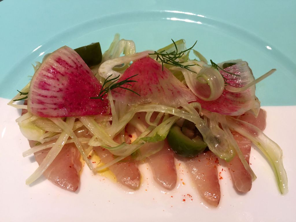 El menú de comida, por unos módicos 39$, nos da a elegir un entrante y un principal. En mi caso opte por el Kona Kampachi, pez limón crudo proveniente de Hawaii que aliñan con un poco de pimentón picante, aceite acompañado de rábano, hinojo, espelette y eneldo.