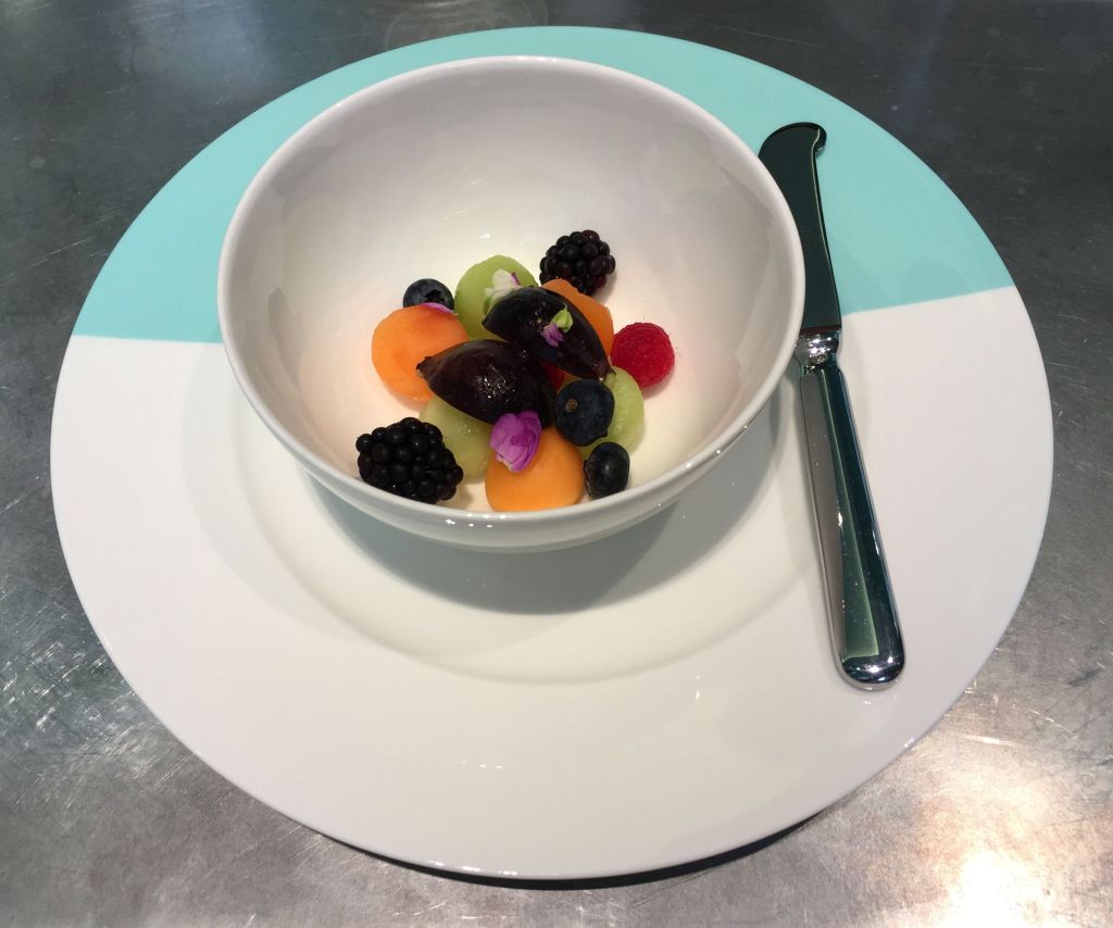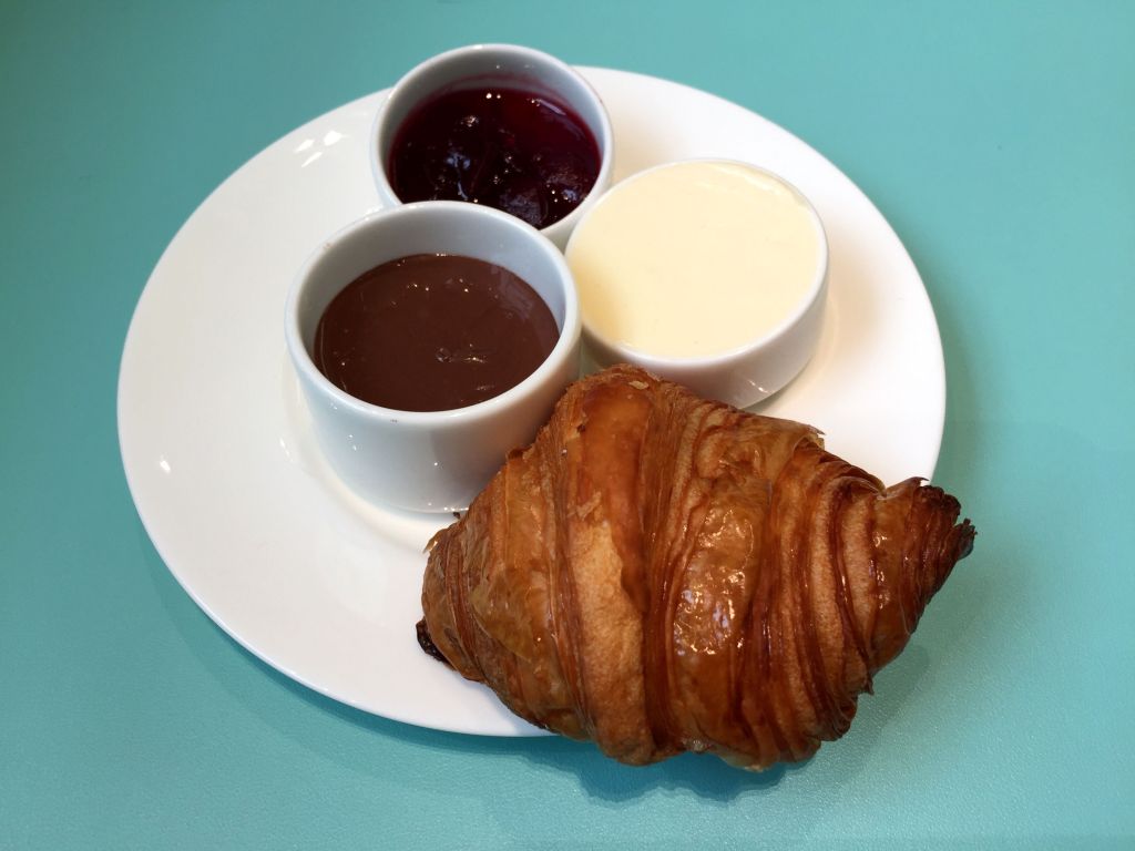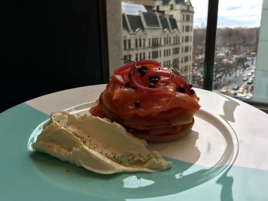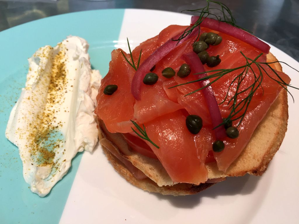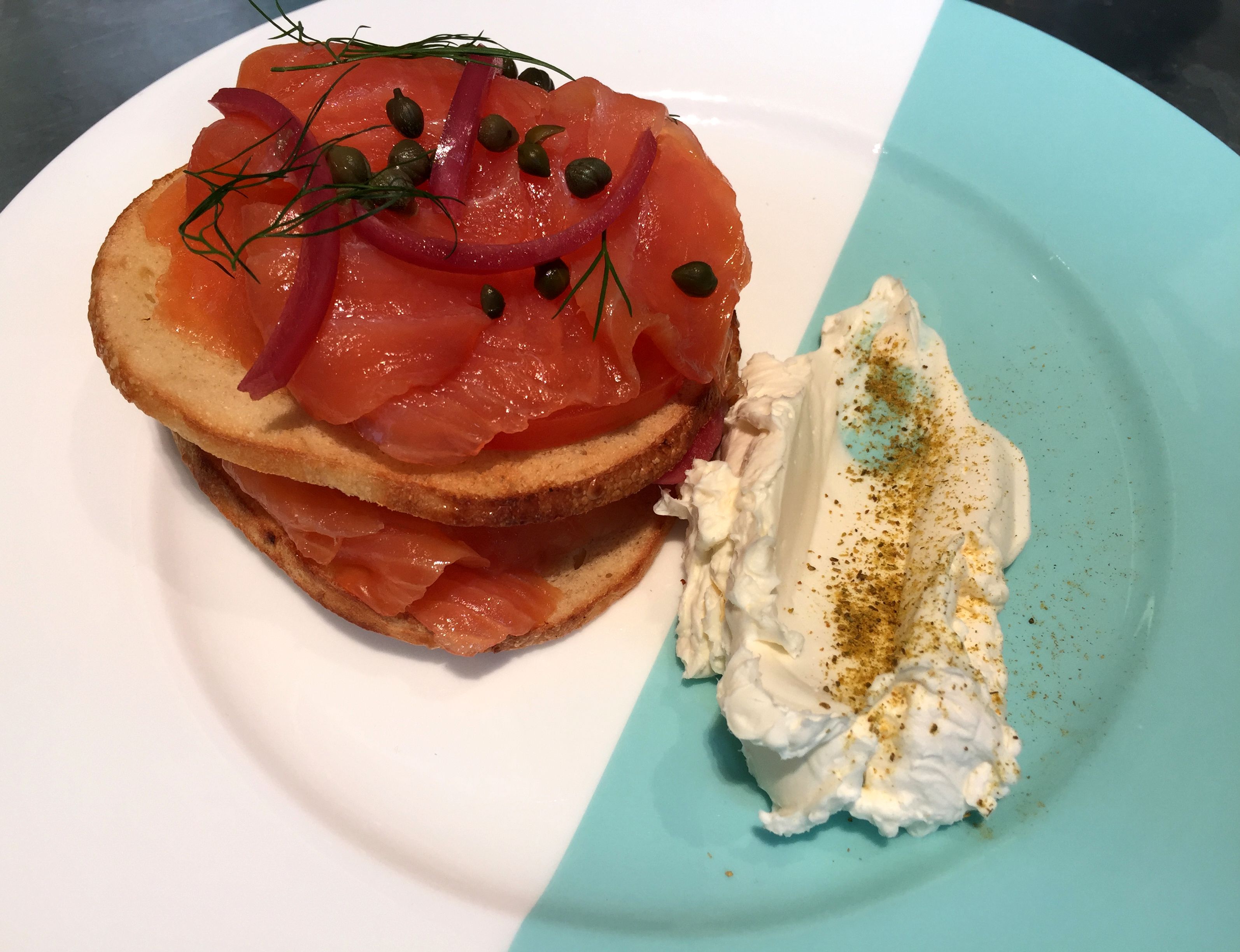 ¿Qué podemos comer en el Blue Box?. En la opción desayuno, por 29$ elegimos entre café o té que se sirve acompañado de un mini croissant con Nutella, mantequila y mermelada; unas frutas de temporada y bayas; y a elegir entre cuatro, en este caso optamos por el baggel con salmón ahumado, crema de queso con curry, tomate, alcaparras, cebolla roja y eneldo.