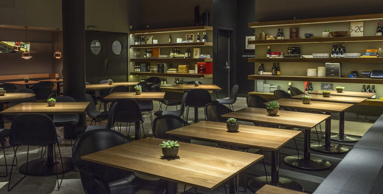 La disposición del restaurante es la clásica americana, mesas muy juntas que sin duda son aprovechamiento máximo del caro metro cuadrado que se paga en Mahattan. Algunas mesas más grandes albergan grupos de personas más numerosos, las menos. Estanterías con literatura gastro y alguna barrera vegetal para separar zonas.