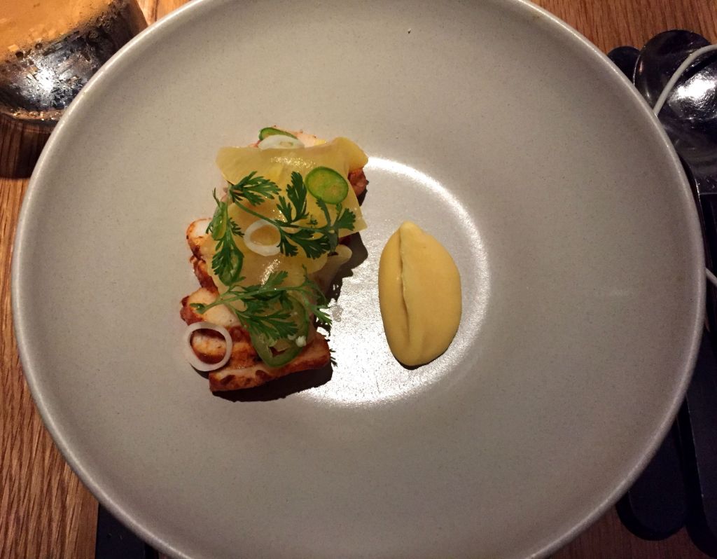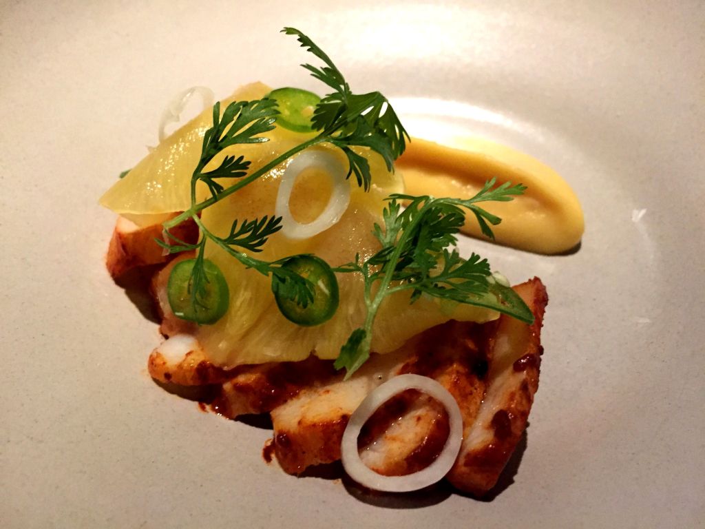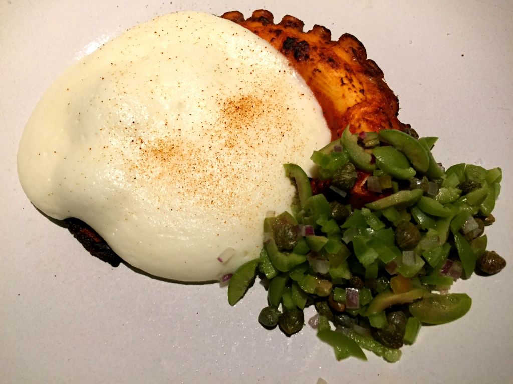 Seguimos con pescado, en este caso un pulpo a la parrilla que se acompaña de una salsa veracruzana, que es un ejemplo de mestizaje español ya que las alcaparras, aceitunas, oregano, ajo y aceite no eran propias del continente. Otro de los elementos del plato son las blue eye potato, una bien texturizada espuma de patata.