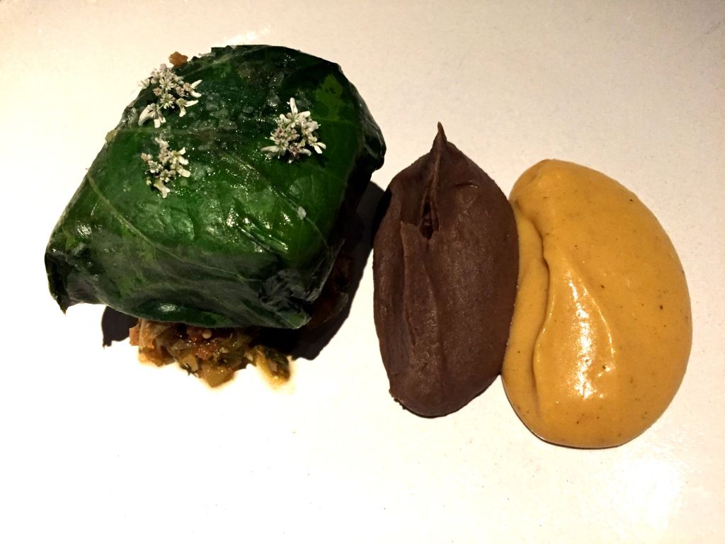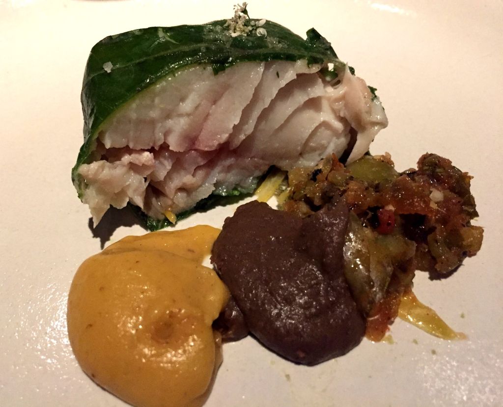 A la par, nos sirvieron el otro pescado. Una lubina rayada envuelta en hoja santa que se acompaña de una picada y unas cremas de frijoles negros y plátano azafranado. La cocción de la lubina era fantástica, jugosa y los tacos resultantes deliciosos.