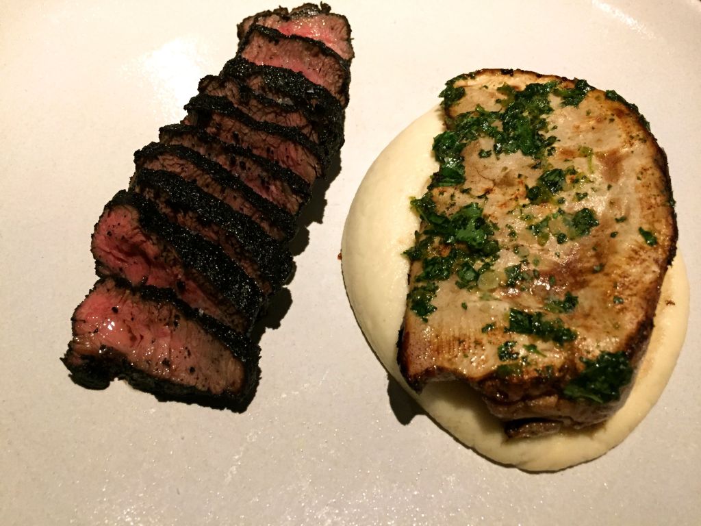 Finalizamos con el Flat Iron Steak, un bonito juego de palabras que además de hacer referencia al distrito donde se ubica el restaurante se traduce como una plancha de hierro plana. Se acompaña de una raíz de apio nixtamalizada salseada con un mojo de hierbas y una espuma. La carne tiene un punto perfecto, jugosa y bien marinada, algo muy típico de la cocina americana, que suele adobar las carnes con largos periodos de maceración.
