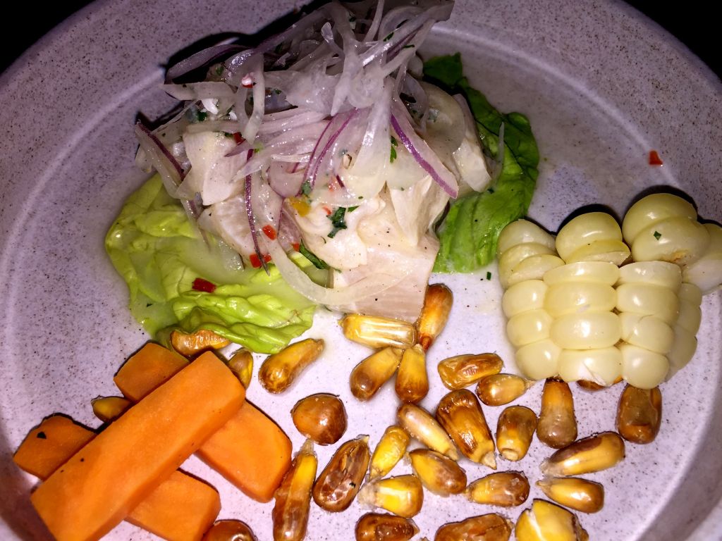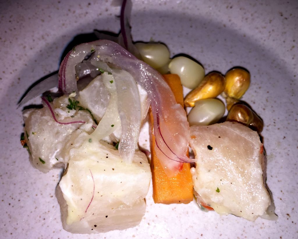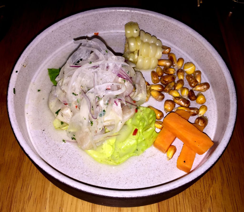Si hay un plato nikkei por excelencia ese es el ceviche de pescado, por supuesto corvina, zumo de lima, aji limo, cilantro, cebolla morada, con su leche de tigre y choclo.