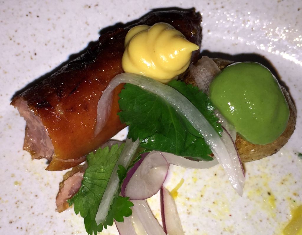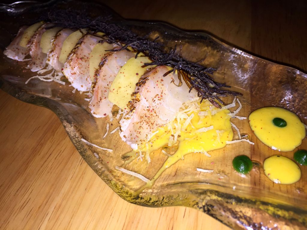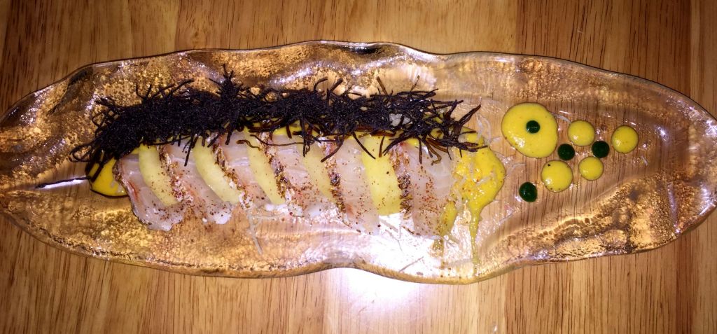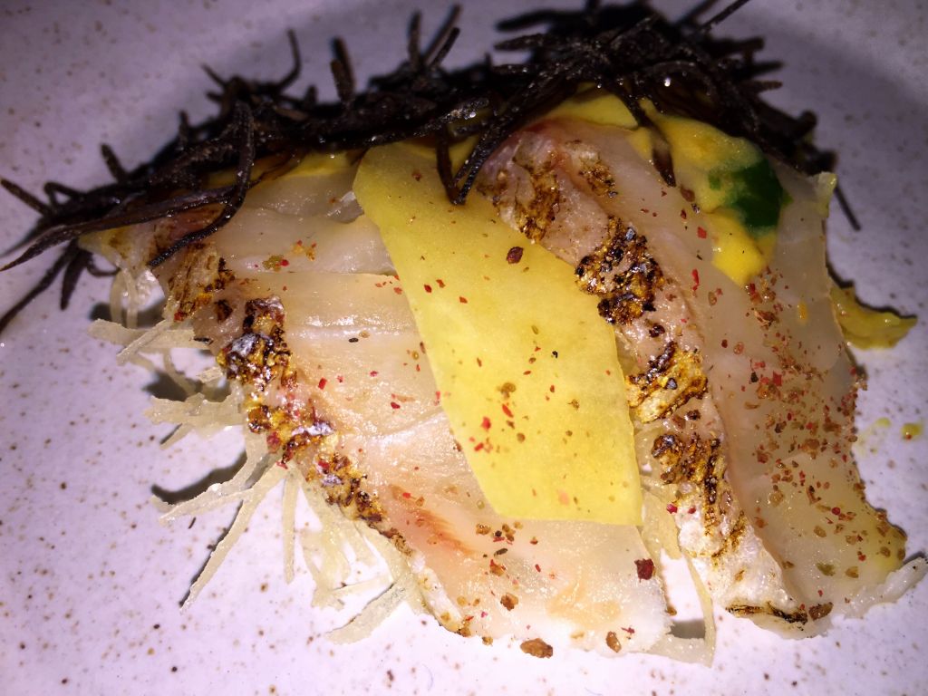 Otro plato imprescindible ha de ser un tiradito, elegimos el Madai. En su descripción en inglés ya lo describen como el encuentro del sashimi con el ceviche. En este caso se trataba de besugo, alga shio kombu, aji amarillo, salsa de mango y harumaki crisp.
