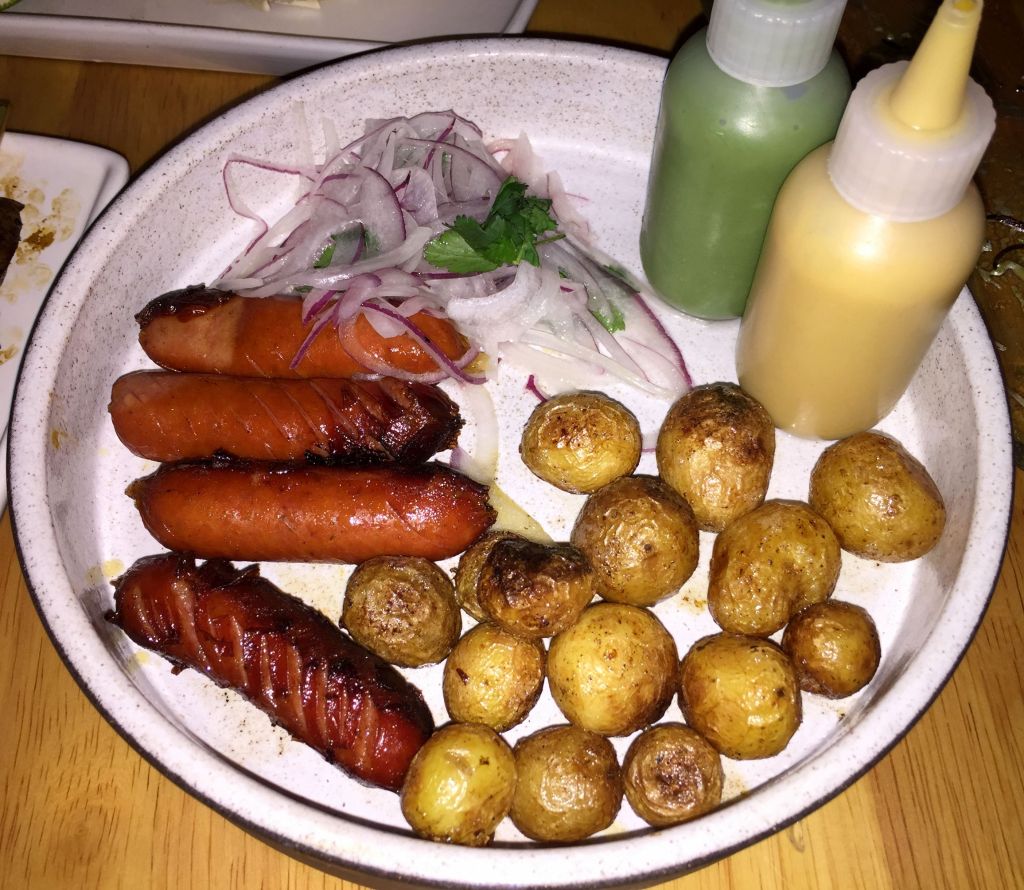 Pues resulta que estas salchichas llamadas kurobuta son la quinta esencia de los japoneses. Si de vacas hablamos el Kobe es el no va mas, pues en el cerdo este sería su homónimo, vamós un gochu asturcelta a lo japones. Además de las patatas, se acompaña de una salsa verde y otra de mostaza de miso.