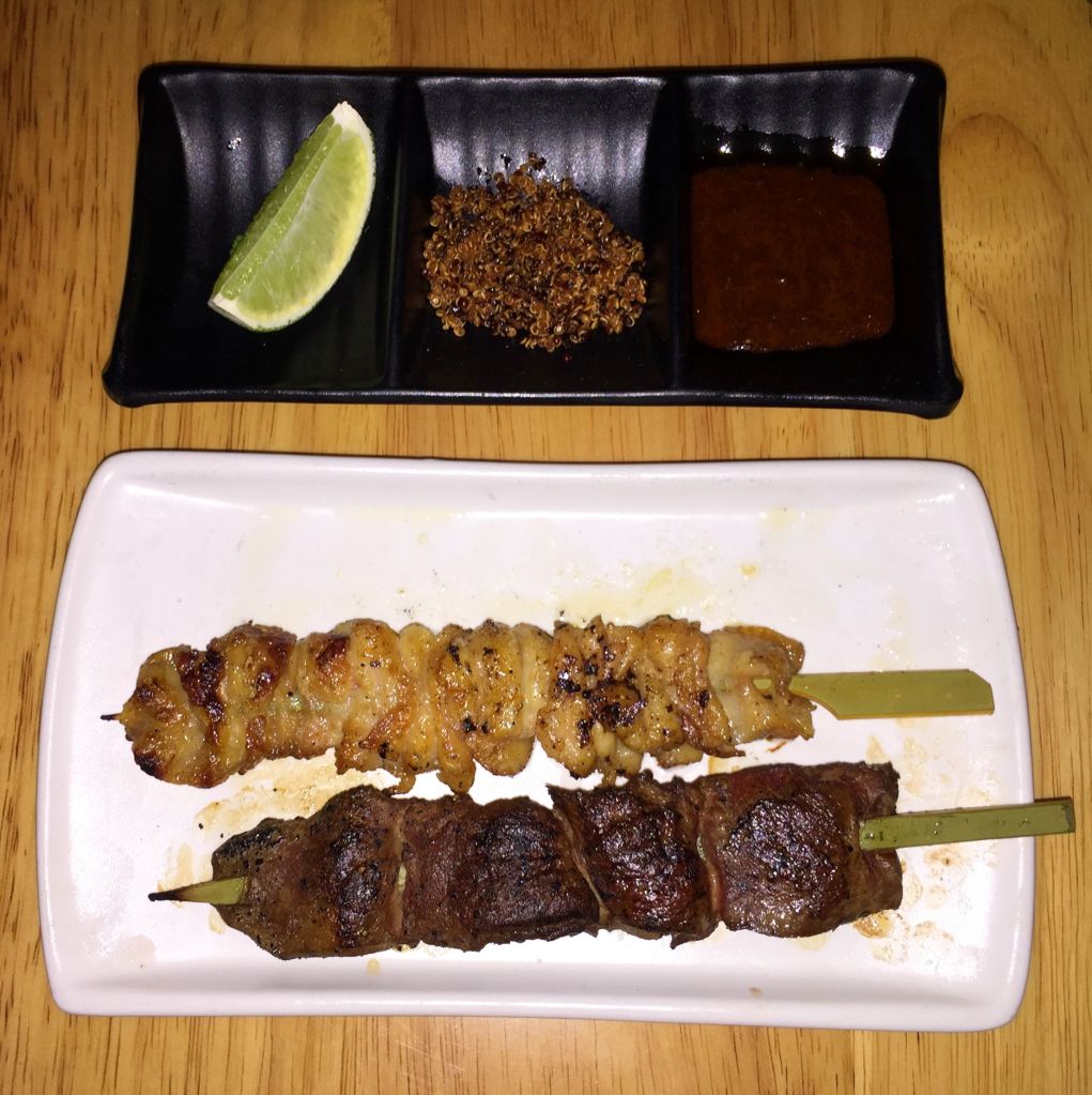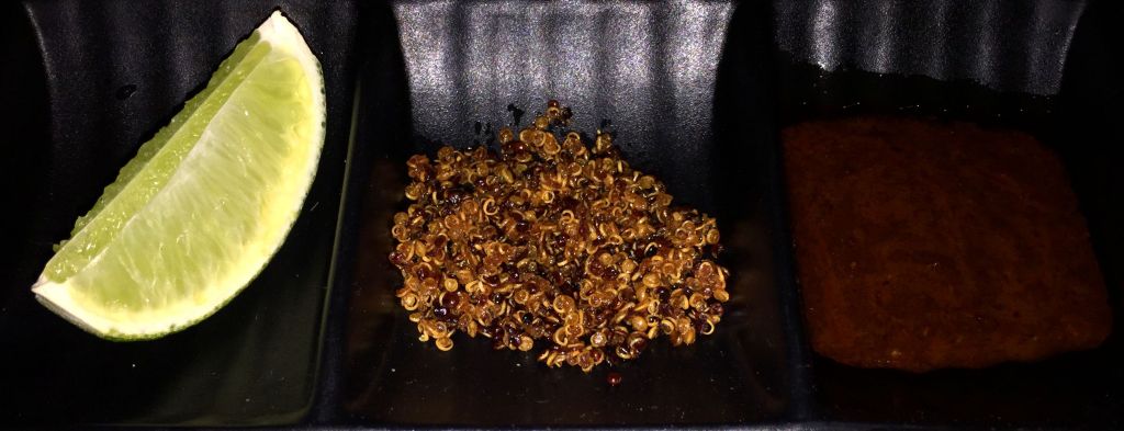 Turno de las brochetas o kushiyaki. Ofrecen unas cuantas clases, siendo la ternera, cerdo o pollo los posibles animales donantes, todas ellas hechas al grill robata. Nuestra elección fueron las Kawa de piel de pollo crujiente y los anticuchos de corazón de ternera, que se acompañan de un trozo de lima, quinoa crujiente y una salsa BBQ deliciosa.