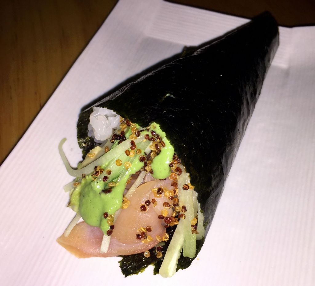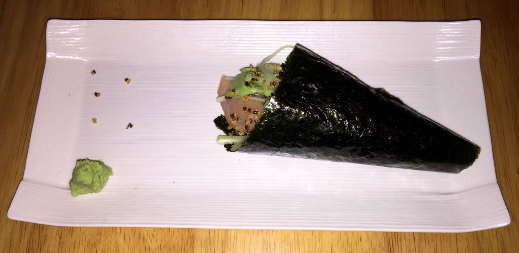 Aparece en la mesa un temaki de salmón y cuando empezamos a hilar que no era lo que habíamos pedido, amablemente nos dicen que no lo cobrarán y que ahora llega el seleccionado.