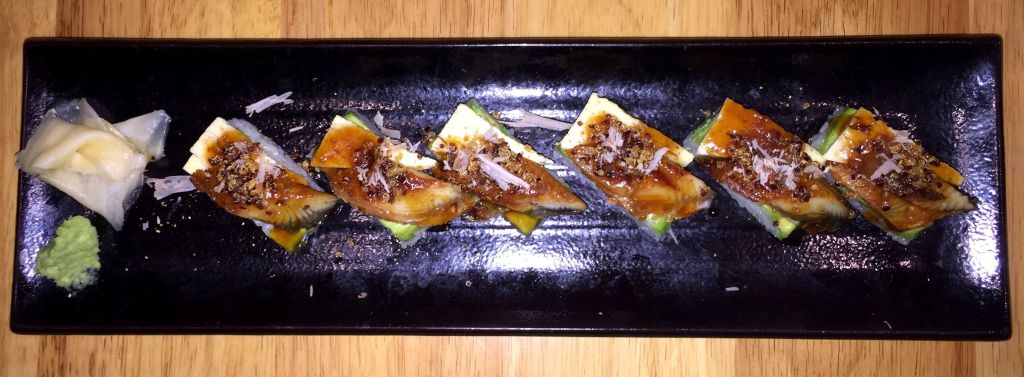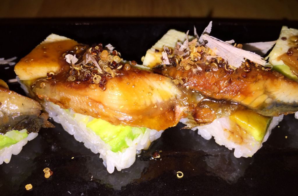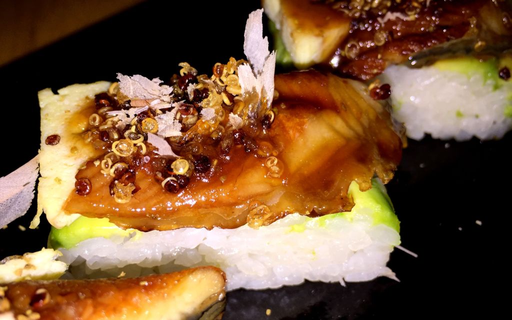 Para ir cerrando nuestro menú de libre configuración le llegó el turno al sushi. Primero unos maki nikkei donde el elegido fue el Unagi Hako hecho con arroz, anguila, tamago (tortilla japonesa), quinoa crujiente, aji panka kabayaki (salsa de anguila con ají), sansho (bayas con toques aromaticos de limón, menta, citronela y pimienta) y katsuobushi (lascas de bonito seco).