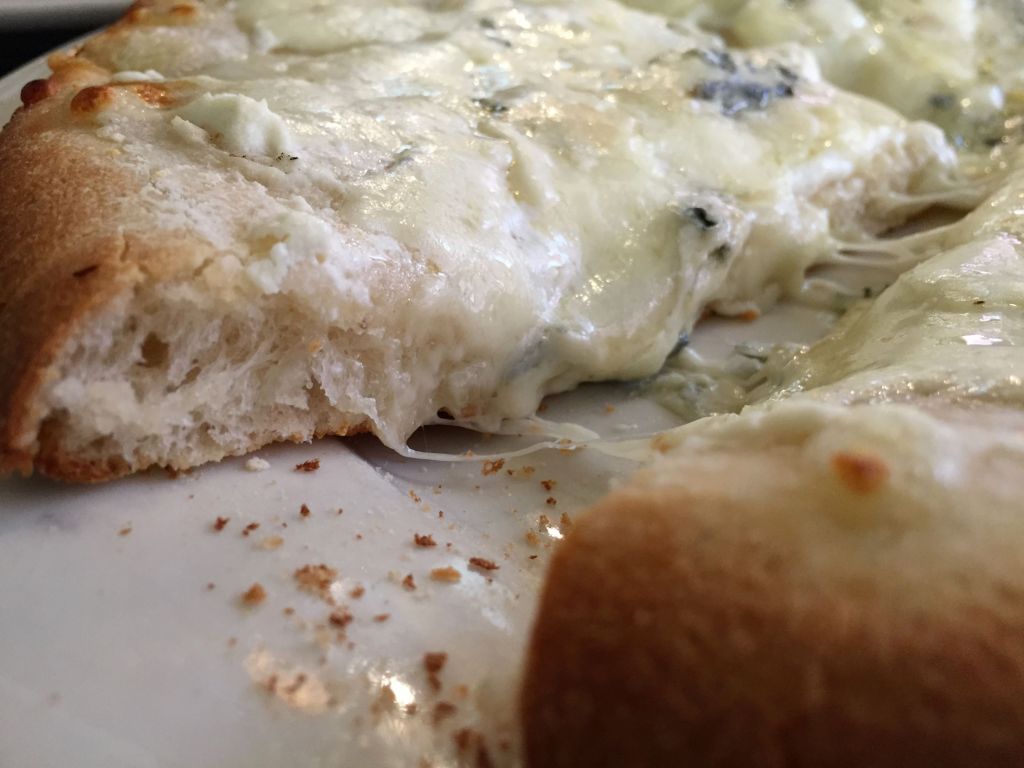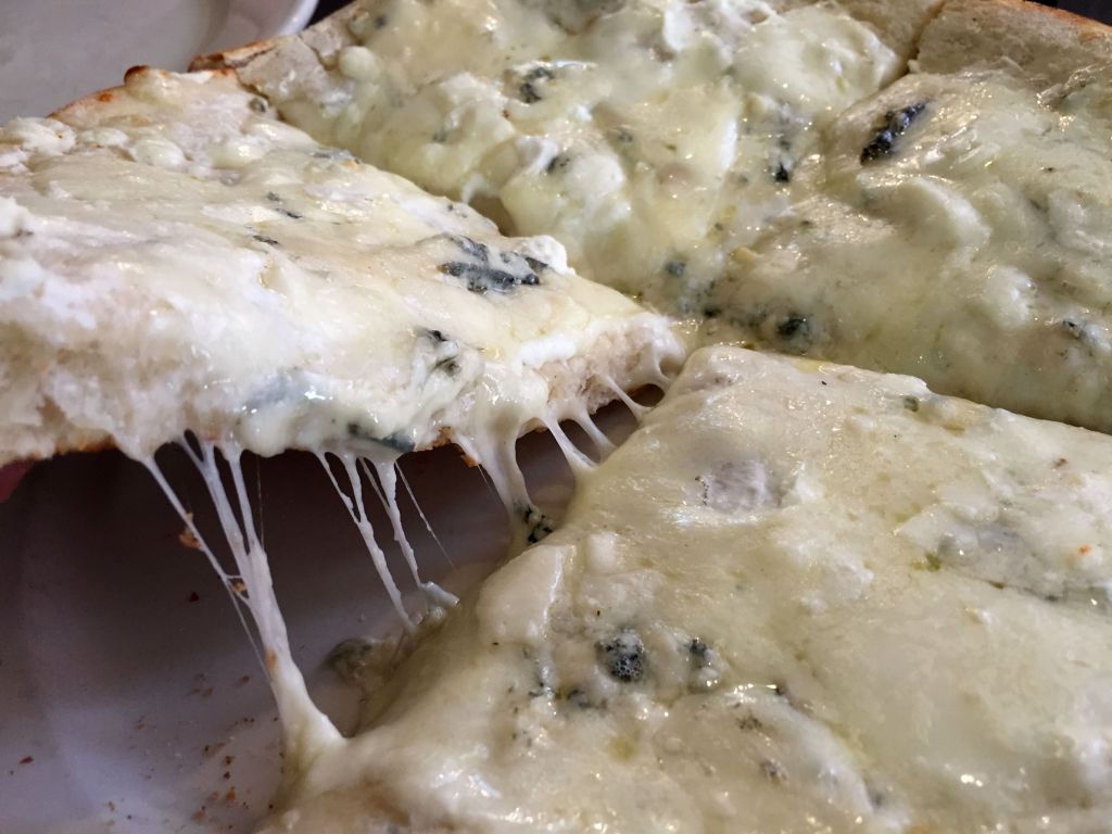La pizza era una de esas adaptaciones que os digo de los italianos, no se trataba de una masa fina, era gordita, pero crujiente y esponjosa. Los quesos no los recuerdo al completo, saturé de tanta información, pero claramente había mozzarella y gorgonzola.