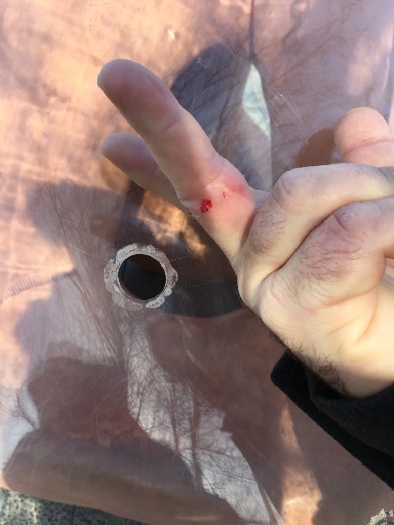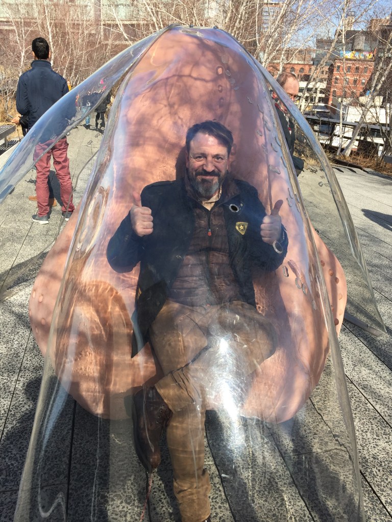 En el High Line el High Light del día, no se me ocurre más que meter el dedo en ese agujero que veis, me entró la claustrofobia (por eso no llevo anillos) y con la congoja tiré fuerte para sacarlo con el resultado que veis. Las carcajadas de mi novia contagiaron a todos los que allí presentes vieron mi estupidez.