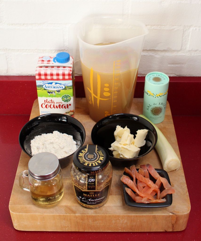 0,9-1L de caldo de pollo, 50grs de mantequilla, 50grs de harina, 3 cucharadas soperas de mostaza en grano tipo Maille à l’ Ancienne, 3 cucharadas de nata para cocinar 18% M.G., Sal de Ibiza de limón y pimienta verde, 100ml de vino blanco, ajo puerro y salmón ahumado.