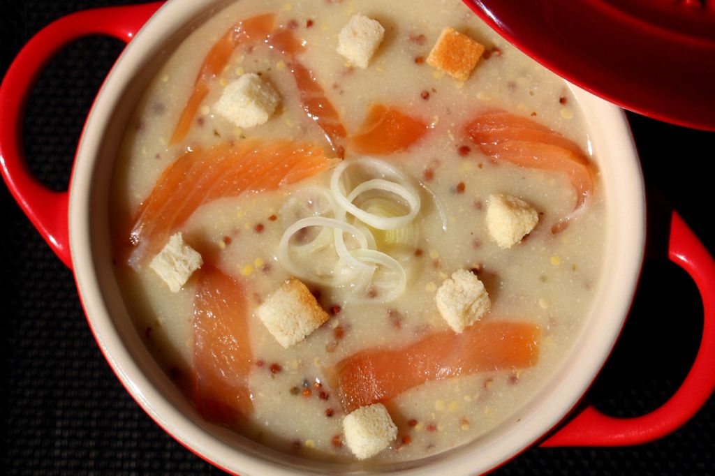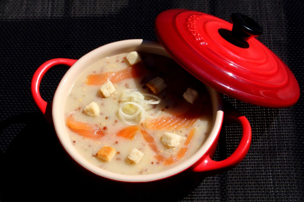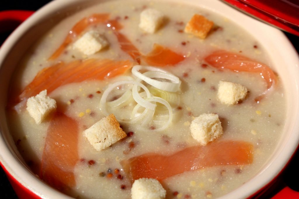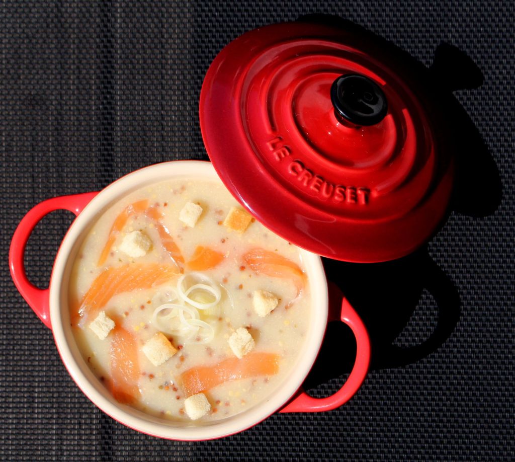 Efectivamente, lo llaman sopa pero en realidad tiene la textura de una velouté o crema ligera, esta viene dada por ligar una roux. Su elaboración es bien sencilla y tal y como me indicó Ale, la suelen acompañar de bacon o de salmón ahumado, esta última fue mi elección y la verdad que combina de lujo.