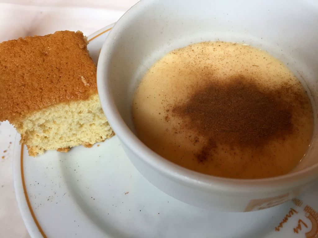 De postre y como parte del tradicional cocido, nos sirven unas natillas con bollo y café de puchero.