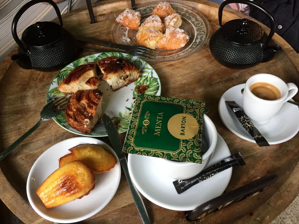 Ya visteis más arriba el pan que degustamos en la comida, ahora os enseño la caracola, el doughnut y las madalaines de commercy que acompañaron nuestros café y tés.