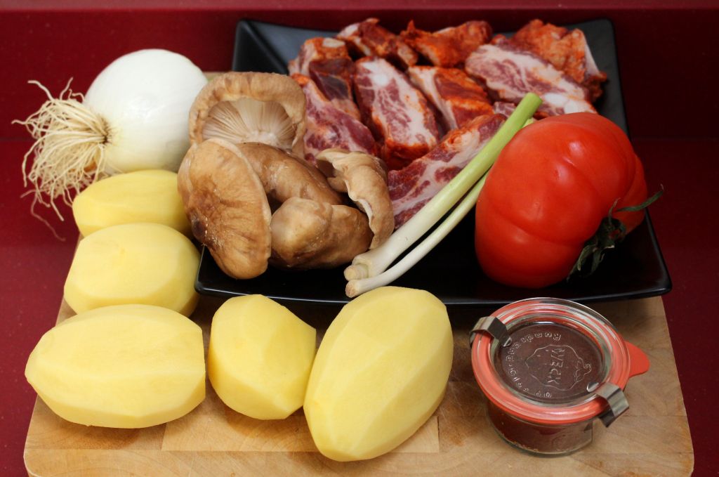 1 costillar de cerdo adobado, 2 ajetes tiernos, 1 cebolleta, 1 tomate, setas shiitake, 5 patatas, 2 cucharadas de chipotle en polvo, AOVE, sal y agua.