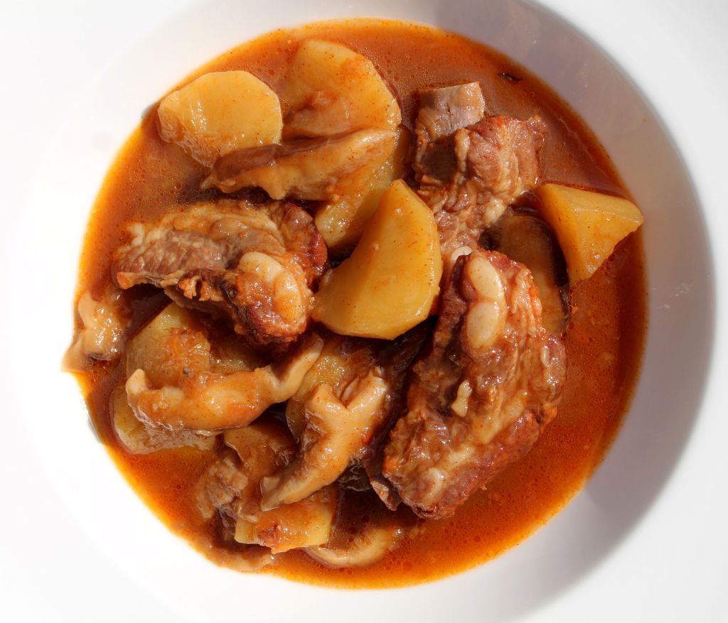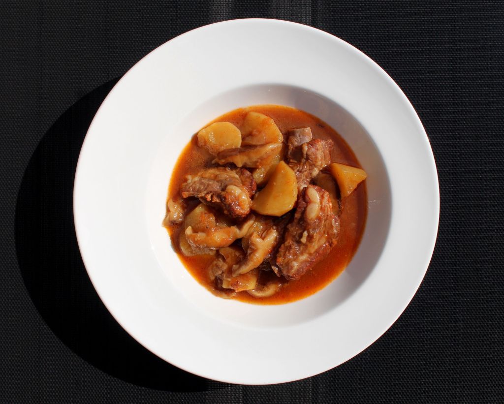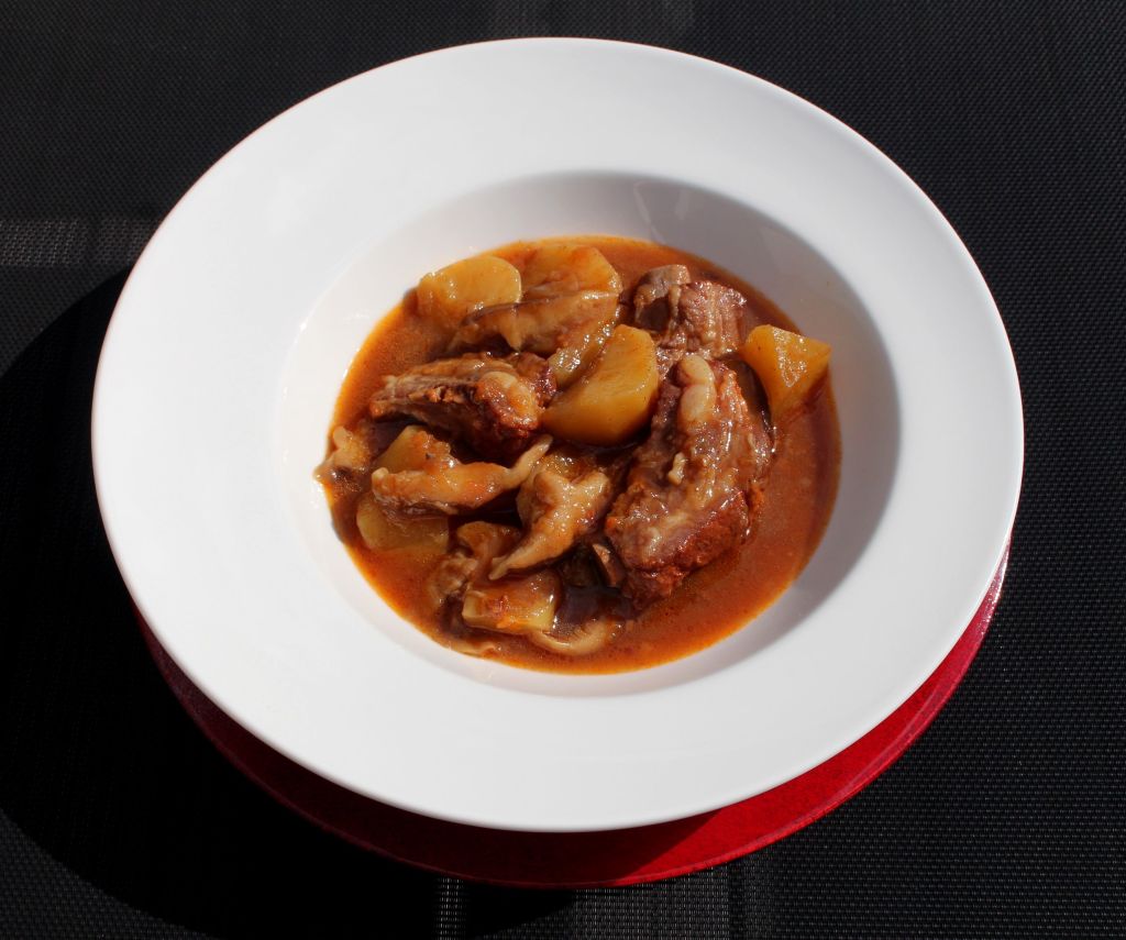 A fuego medio, sin tapar la cacerola, ya tendremos nuestro guiso listo. Como las costillas sueltan mucha grasa procedí con el desgrasado, una cuchara y con paciencia eliminamos la balsa de grasa innecesaria. Servimos.