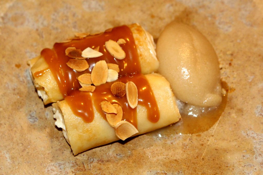 En mi charla con Jaime lo comentamos y me dijo que había pensado en rebajarla. Yo creo que sería un error, la gracia y distinción que la hace única es que sabe a queso. Si que le sugerimos permutar el sorbete de sidra a la tarta de queso y el helado especiado pasarlo a los frixuelos.