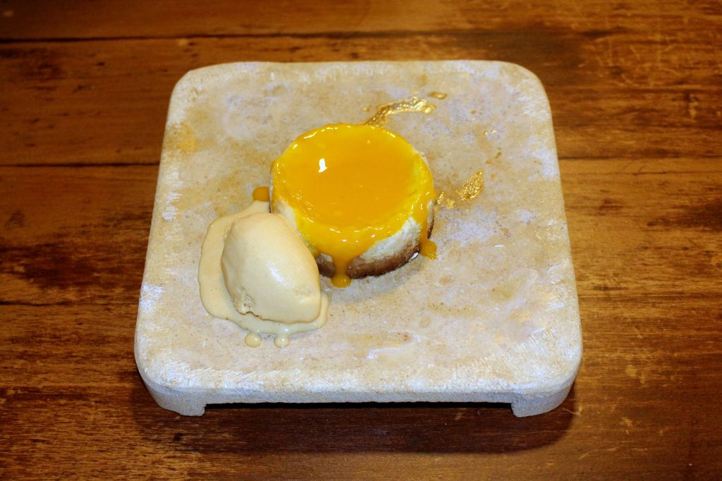 La tarta cremosa de queso y helado especiado es de las que sientan cátedra. Elaborada con cinco quesos, regada con una salsa de mango, la potencia de sabor enamora. Es como si hubiésemos pedido queso al postre, incluso seguí regándolo con sidra algo que cuando llegan los postres nunca hago.