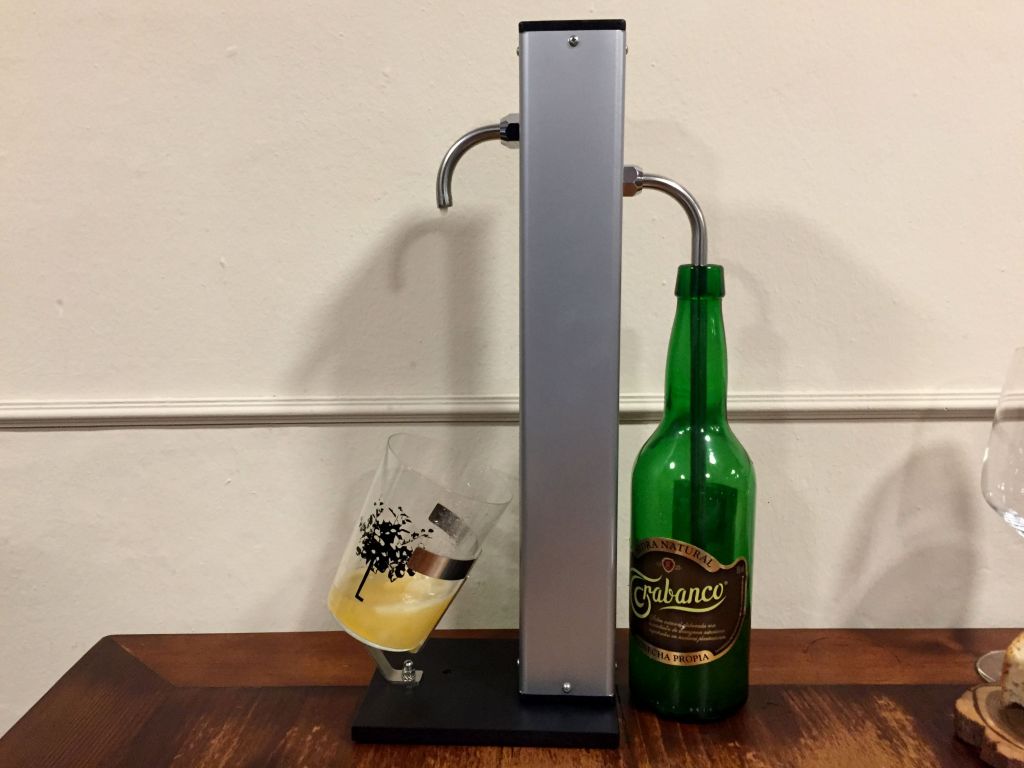 Ya en el comedor, el escanciado se realiza con uno de estos aparatos que han hecho mucho por la promoción de la sidra. Más restaurantes se han animado a tenerla en carta y en nuestras casas resulta tan necesario como un mortero.