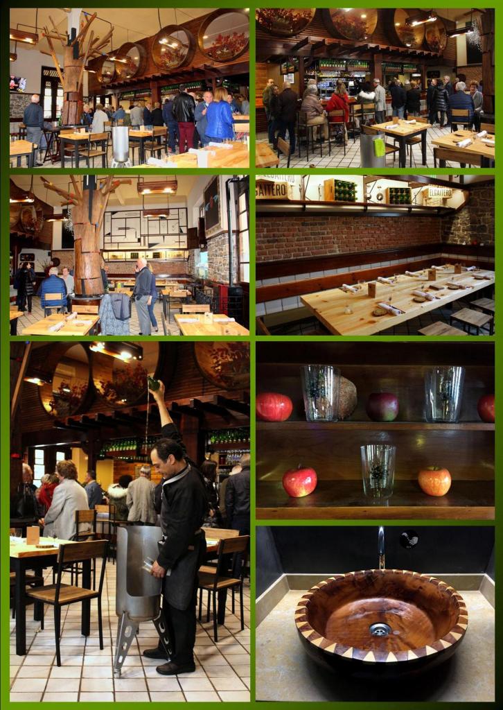 Se han mantenido unos cuantos elementos del anterior negocio, me parece un acierto haber conservado el gran mural de hierro. La zona de sidrería se ve muy luminosa y el nuevo foco de atención se centra en una escultura de un manzano así como en los cuatro grandes ojos en forma de tonel encima de la barra, tras los que se esconde el restaurante.