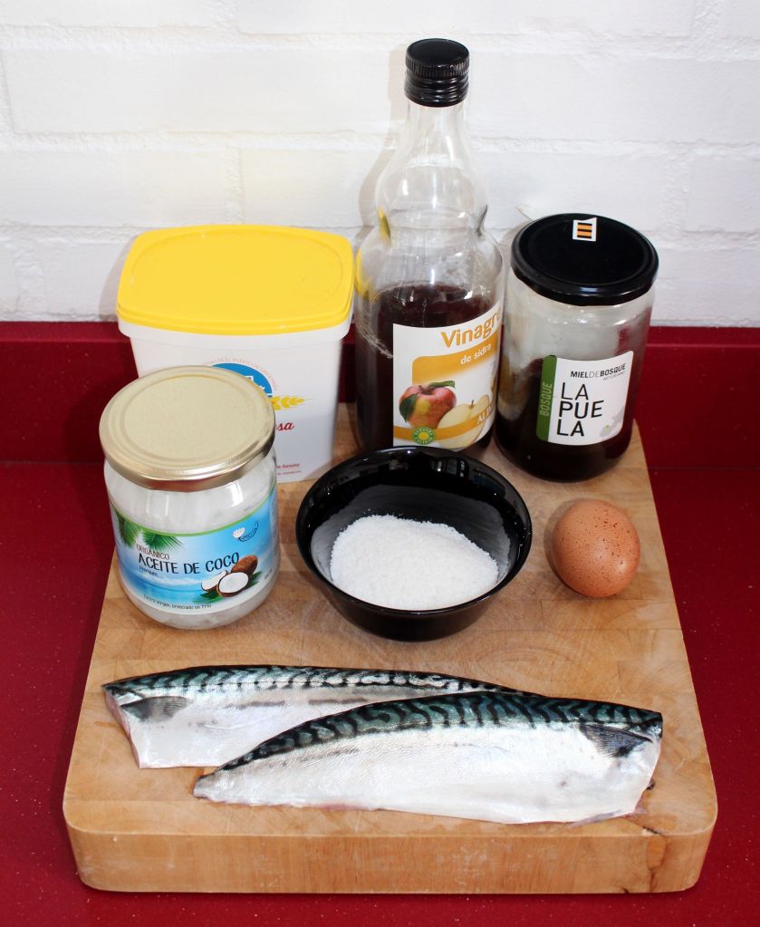 1 xarda (verdel, caballa, macarela), miel, aceite de coco, vinagre de sidra, harina especial de frituras, 1 huevo, coco rallado, sal, agua y AOVE.