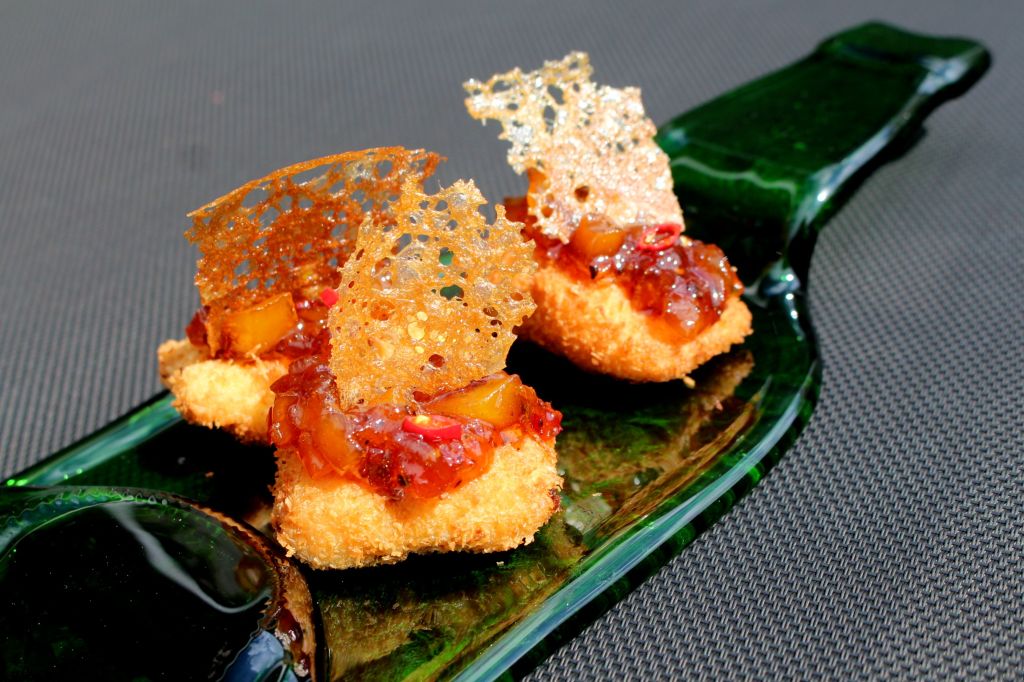 Ahora vamos con el emplatado. Sobre cada trozo de pescado ponemos una cucharadita de chutney de mango, cortamos un poco de la rejilla crujiente y lo clavamos en el chutney verticalmente, rematamos con una rodajita de chile.