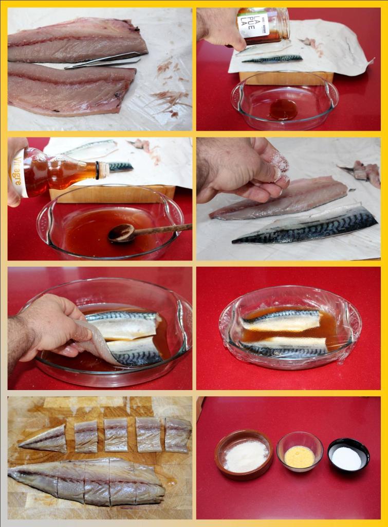 En una fuente ponemos miel en abundancia y vamos echando el vinagre hasta que se vaya diluyendo y mezclando, debe ser suficiente como para cubrir toda la base, porque luego podemos ir moviéndolo sin necesidad de que esté todo el pescado cubierto. Salamos los lomos y los sumergimos para después tapar el recipiente con papel film y refrigerar al menos media hora.