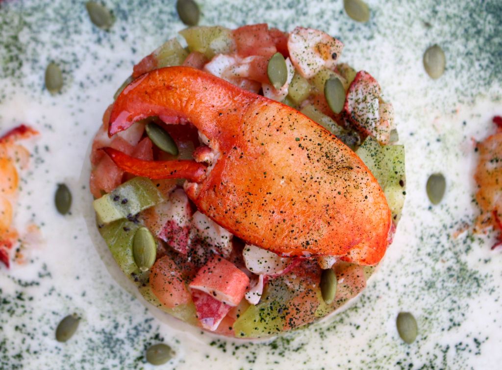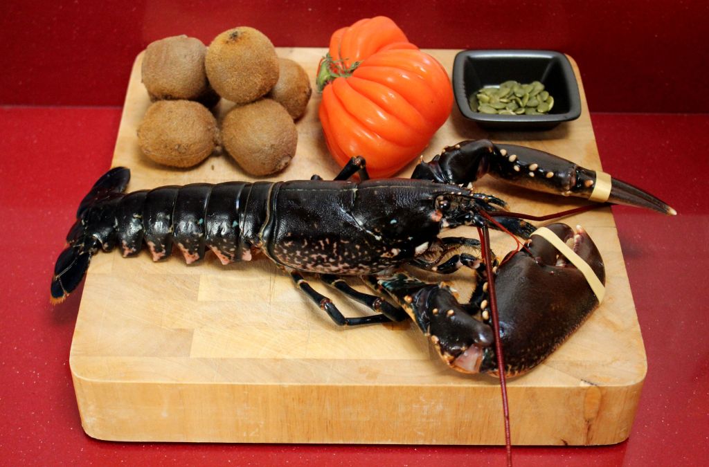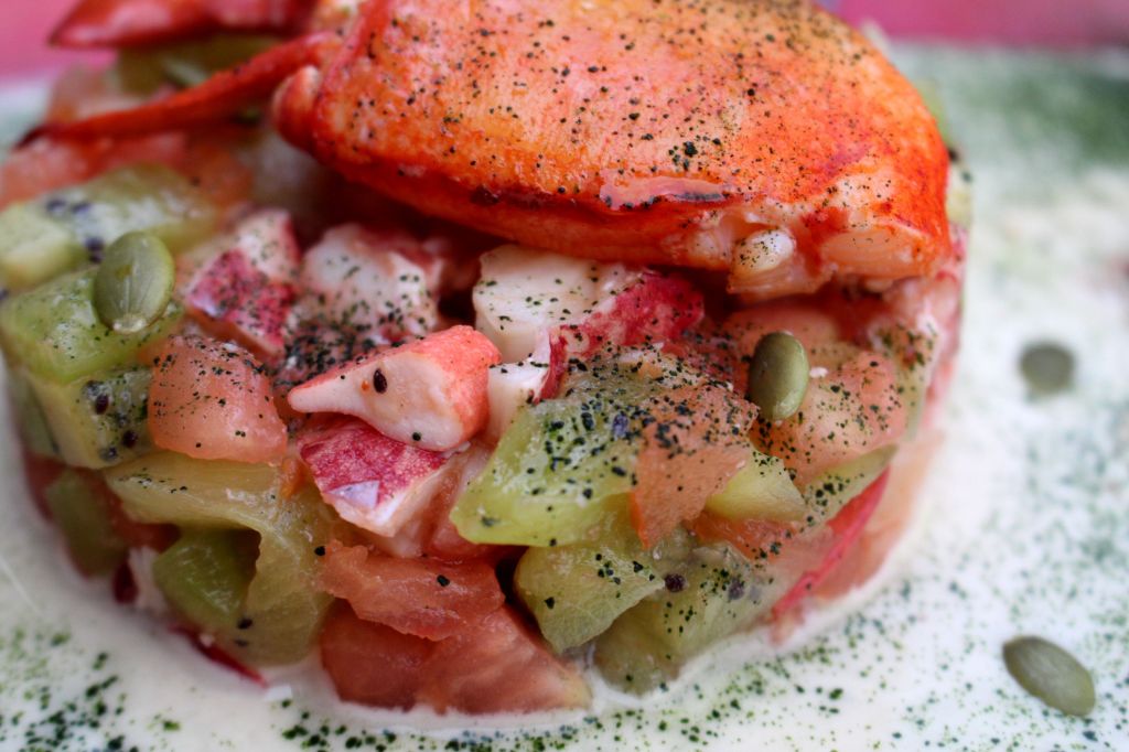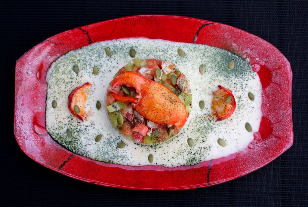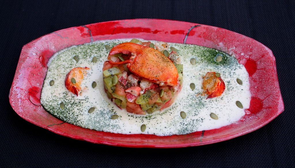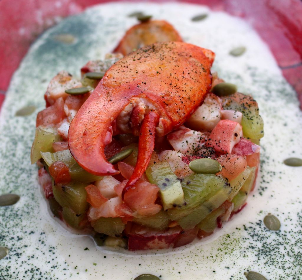 Para el tartar: 1 bogavante pequeño, 5 kiwis, 1 tomate corazón de buey, unas gotas de sriracha, plancton marino y pipas de calabaza.