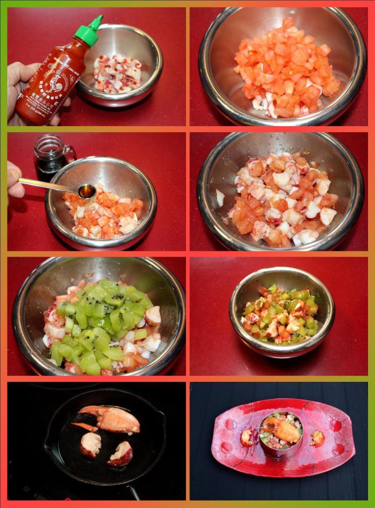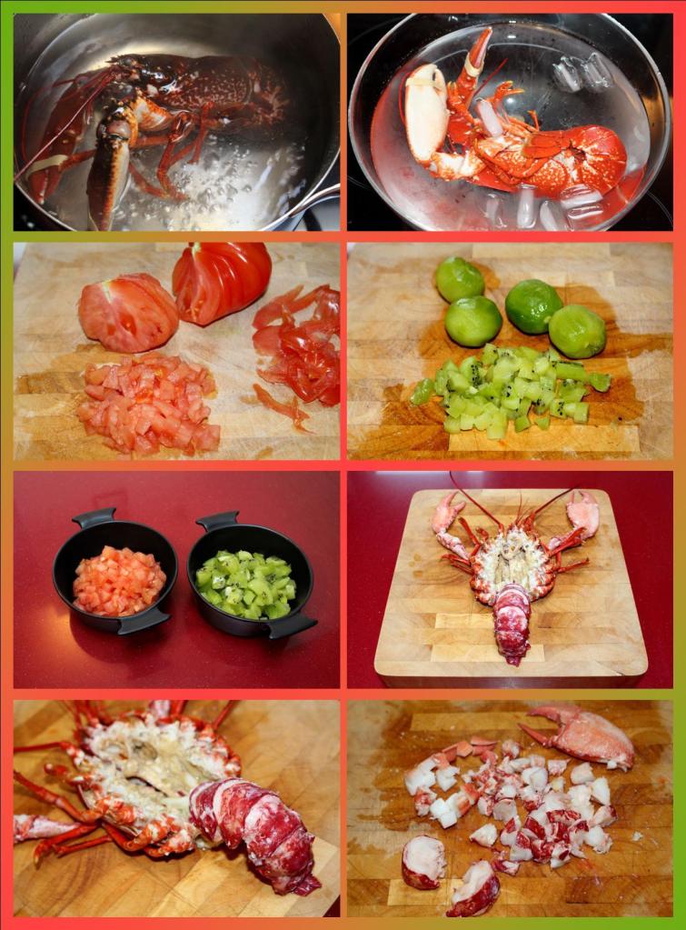 Durante este tiempo aprovechamos para pelar los kiwis y el tomate, lo cortamos en dados pequeños. Pelamos el bogavante, de la cola reservamos dos trozos y el resto lo picamos no demasiado fino (queremos que se vea y perciba) junto con la pinza pequeña. La grande también la reservamos.