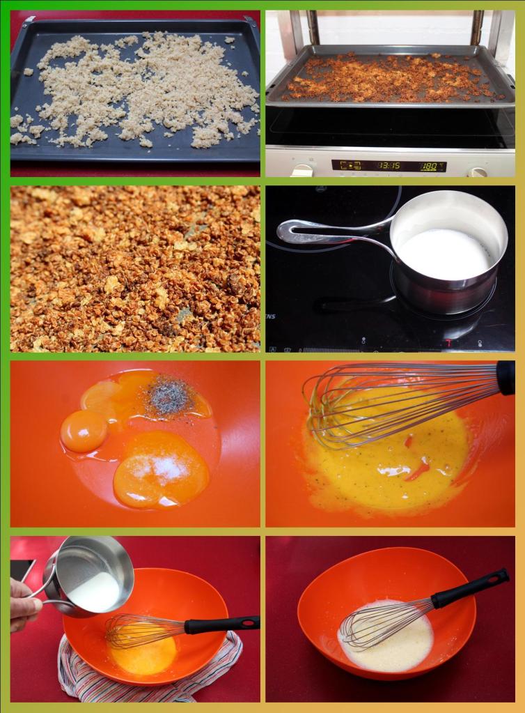 Para la quinoa que previamente habremos de lavar, utilizamos una parte por el triple de agua con un poco de sal, hervimos y cuando haya absorbido todo el agua tras unos 15 minutos extendemos sobre una bandeja o plazo y dejamos enfriar antes de pasar al horno.