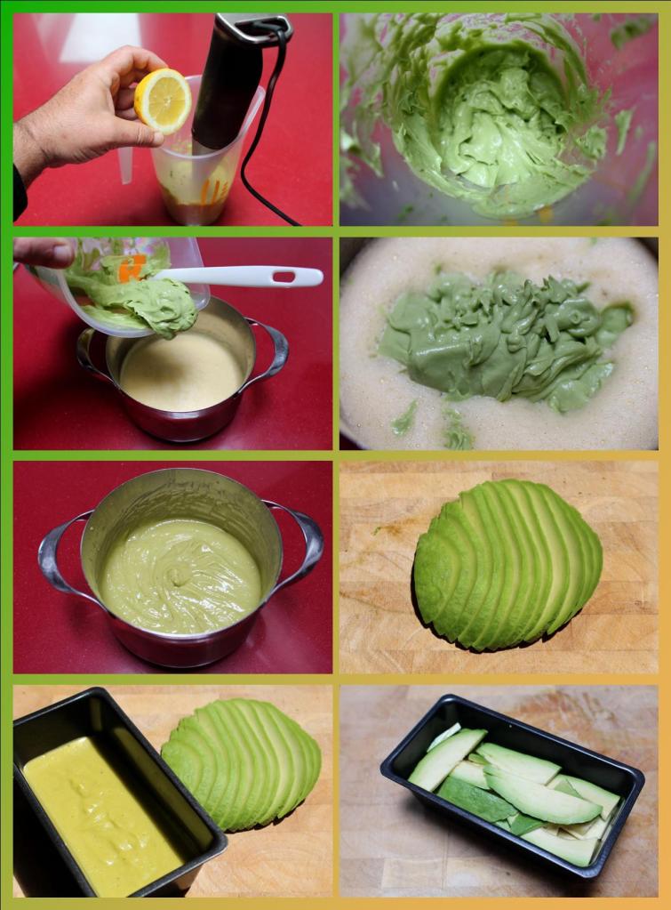 Pelamos los aguacates, reservamos una mitad que cortaremos en láminas finas. El resto lo trituramos con el zumo de medio limón hasta que no quede ningún grumo. Mezclamos esa crema de aguacate con la crema inglesa y pasamos a los moldes. Refrigeramos por al menos 4 horas.