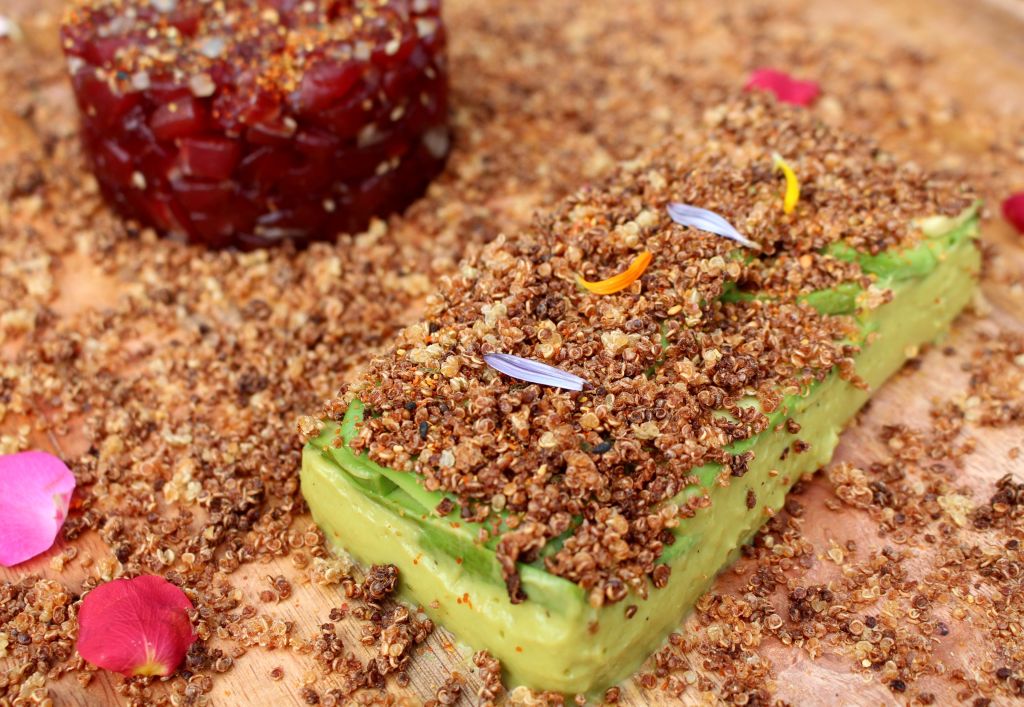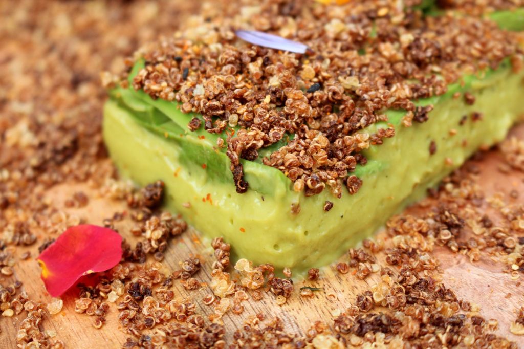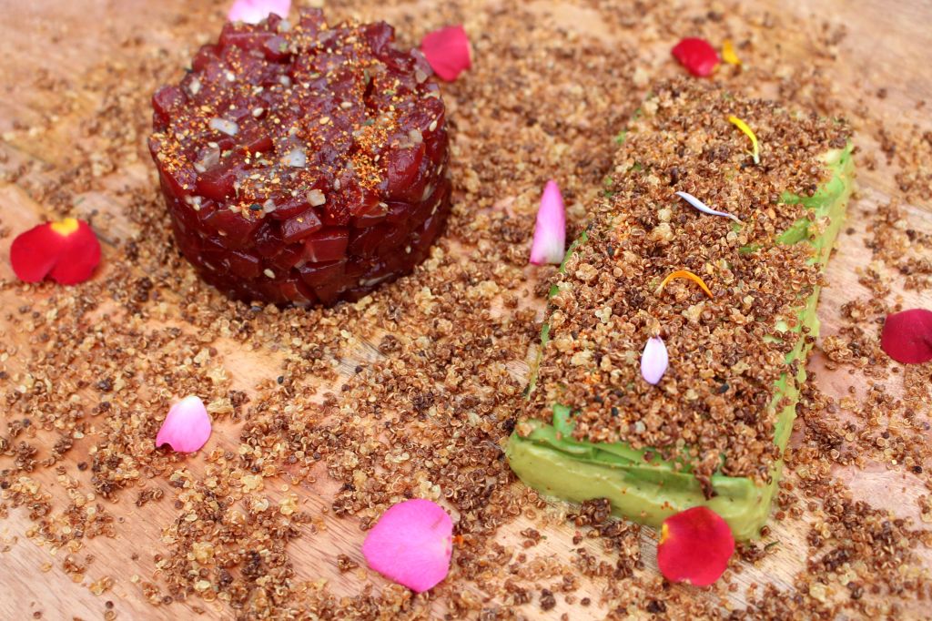 Para la presentación serví la bavaroise en un plato, las laminas de aguacate por encima y espolvoreamos la quinoa. En este caso se acompañó del tartar de atún rojo.