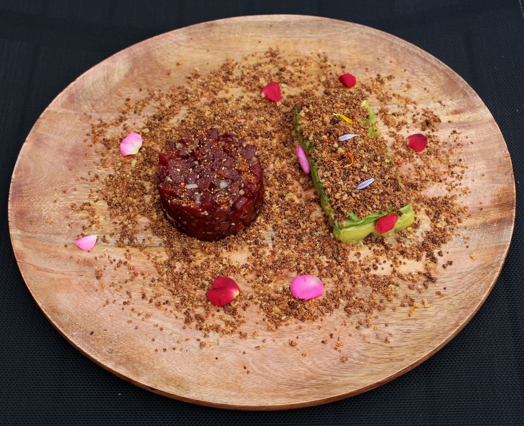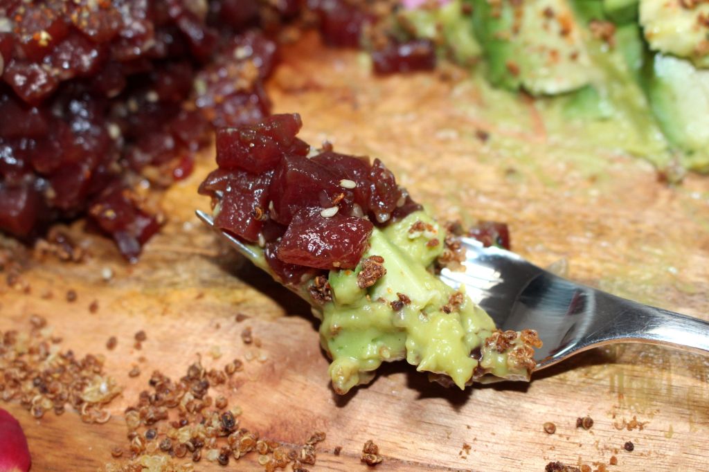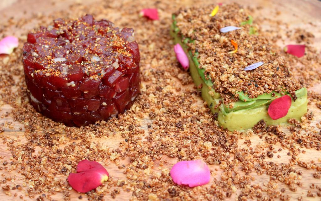 La receta la remato con una tierra de quinoa crujiente. Quise probar como funcionaba con este tratamiento y la verdad, me pareció muy divertido además de ser un buen complemento. El tartar lo suelen servir con unos crackers y la quinoa crujiente os aportará las mismas sensaciones gustativas.