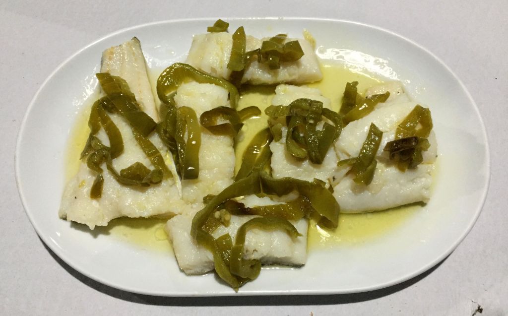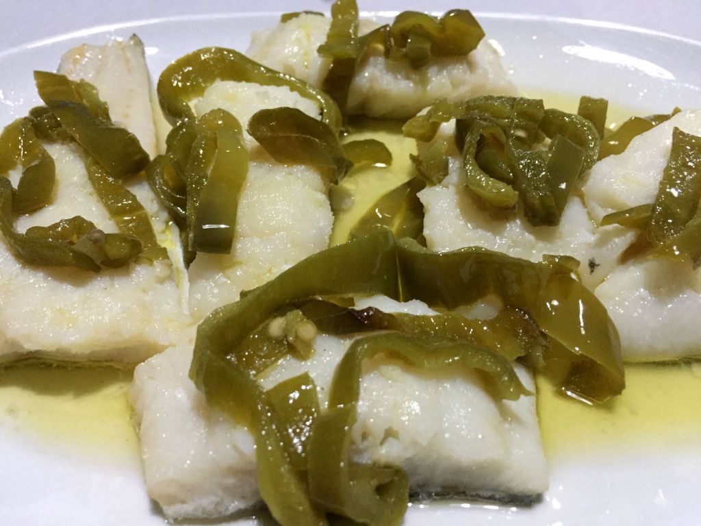 El bacalao con pimientos verdes tenía buen sabor pero la elaboración no era buena, estaba como cocido, no tenía una textura prieta donde se separan las lascas.