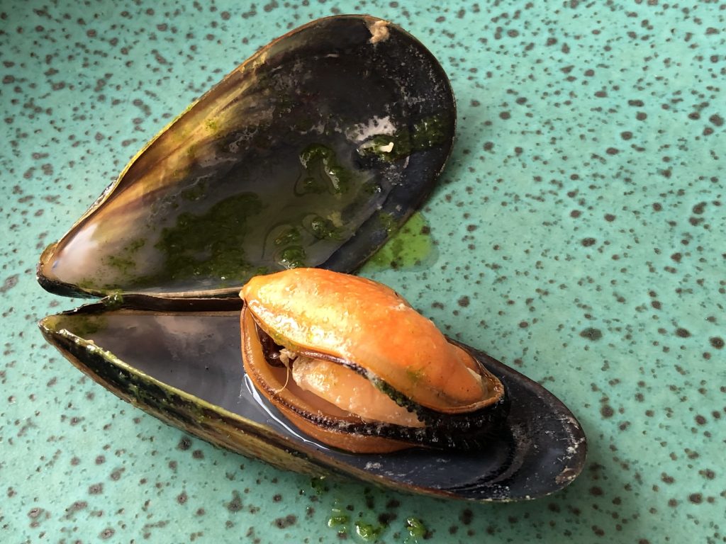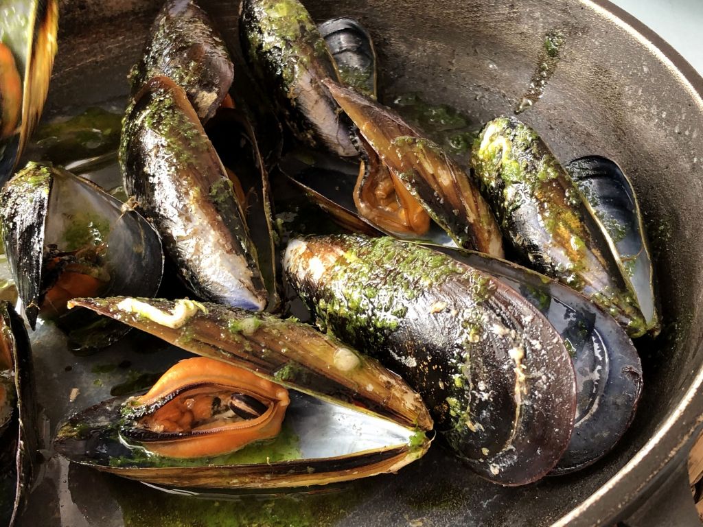 Comenzamos con unos buenos mejillones y unas gambitas de Huelva a la brasa, realmente se nota el sabor del fuego que junto a la excepcional calidad, resultó la mejor manera de abrir boca. Para acompañar, el pan con tomate, que siempre sabe a poco y tuvimos que repetir ración.