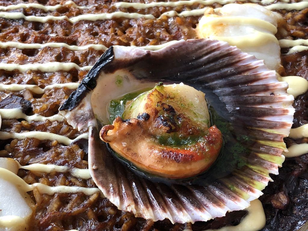 También de variedad Gleva, el siguiente arroz es de volandeiras, pixin y all i oli de azafrán. Se agradece la honestidad de citar las volandeiras y no zamburiñas.