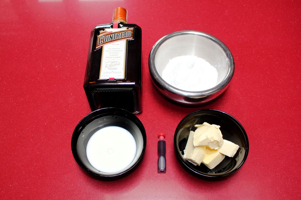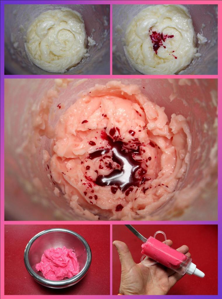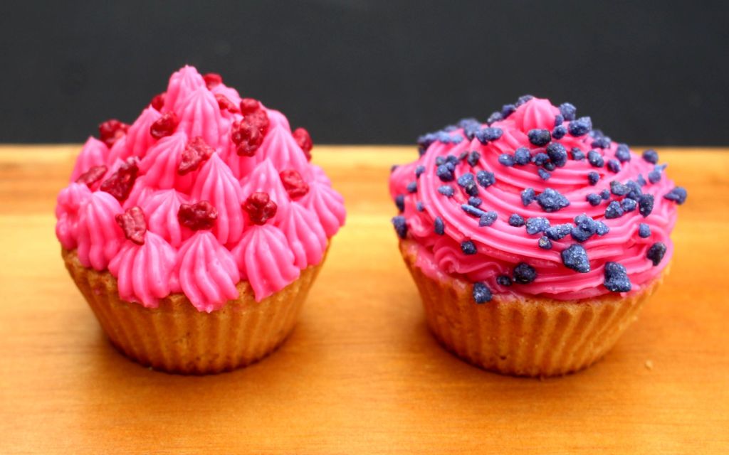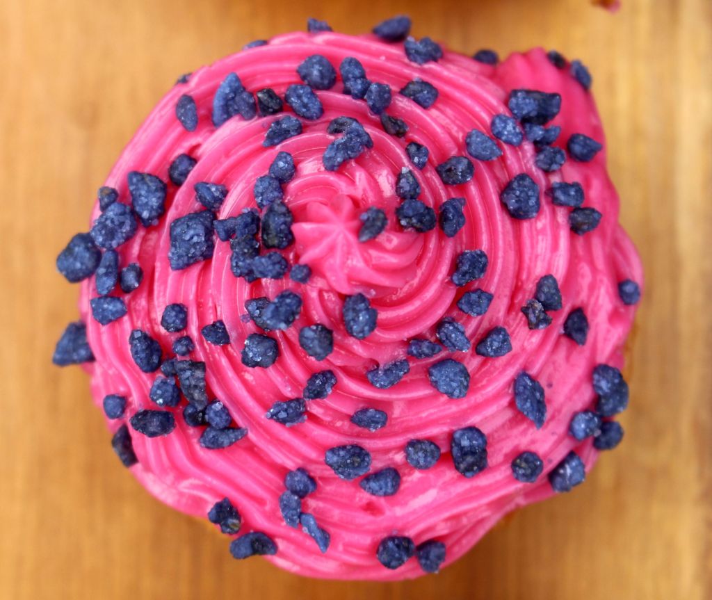Para el frosting: 120 grs. de mantequilla sin sal, 100 de azúcar glas, 6 cl. de leche entera, 1 chorro de Cointreau, colorante, violetas cristalizadas y rocas de frambuesa.