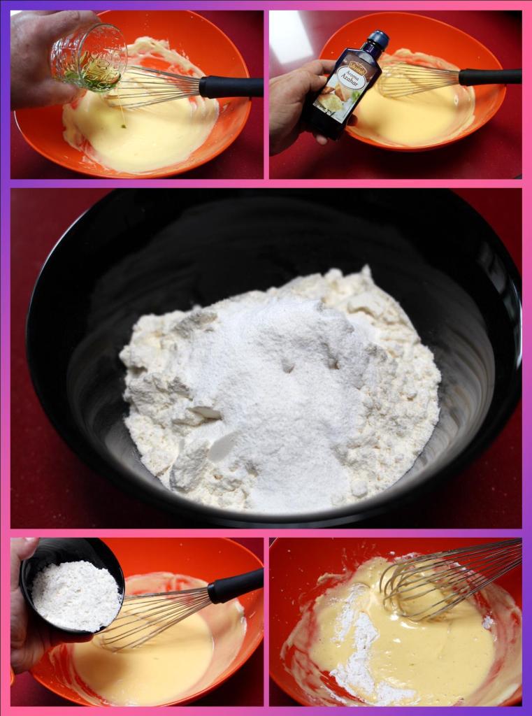 El siguiente paso será añadir el aceite que previamente habremos desahumado con una cáscara de limón, lo echamos despacito en hilo y seguimos con los movimientos envolventes para que coja aire nuestra masa. Le ponemos las gotas de aroma de azahar y agregamos la harina que tendremos mezclada con la levadura. Poco a poco aireando la mezcla con la varilla rematamos nuestra mezcla.