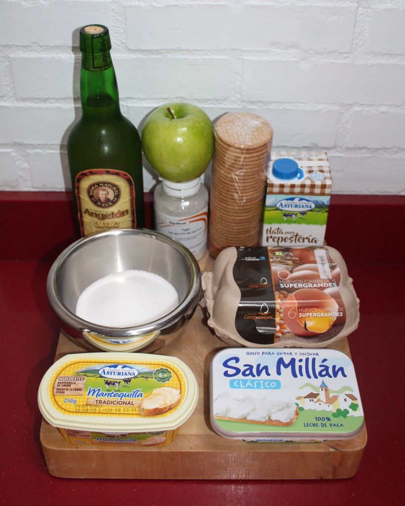 Para el relleno: 200grs de queso crema, 150grs de queso Cabrales, 150grs. de queso 3 Leches de Pría, 150grs de azúcar blanquilla, 250ml. de nata 30% M.G., 6 huevos, mantequilla y 1 manzana Granny Smith.