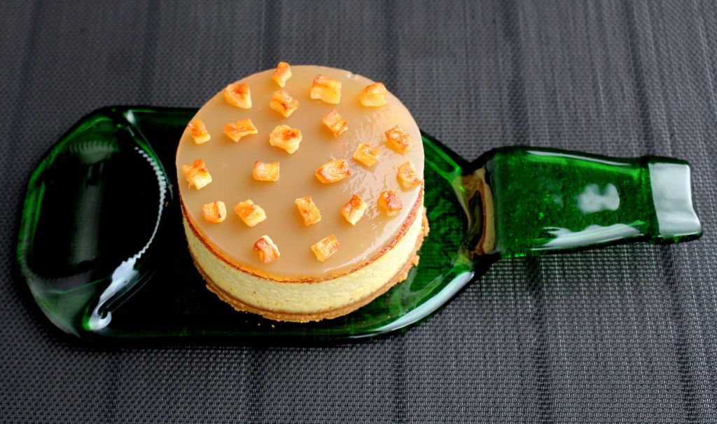 Desde que pensé en hacer la receta ya tenía claro que el recipiente de emplatado sería la botella de sidra aplastada. También tenía claro que no la iba a servir en los típicos triángulos, quería que quedase como un mini pastel y como quiera que la parte central de la tarta era la que tenía mejor color, introduje un aro de emplatar para extraer la porción.