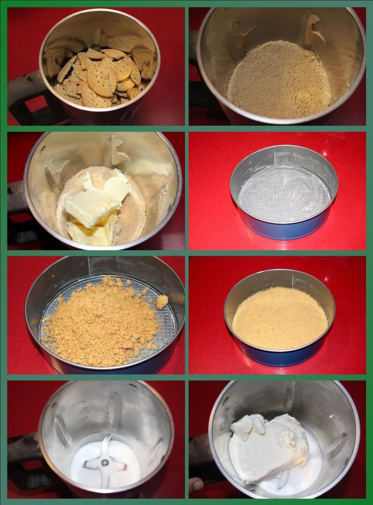 Comenzamos por la base. En un robot de cocina trituramos las galletas, añadimos la mantequilla a temperatura ambiente y apelmazamos en un molde desmontable previamente engrasado con mantequilla. Refrigeramos en el congelador mientras preparamos el relleno.