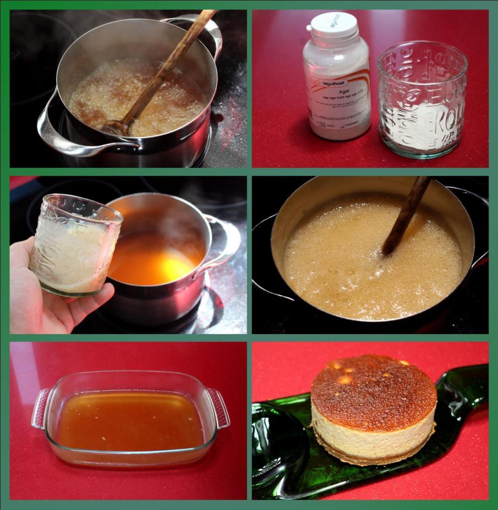 Mientras enfría, haremos nuestra gelatina. Para ello en una cacerola ponemos el azúcar moreno y añadimos la botella de sidra, llevamos a ebullición y le agregamos el agar agar que previamente habremos diluido en un poco de sidra. Removemos y llevamos a ebullición durante un par de minutos, vertemos sobre un molde y esperamos a que solidifique.