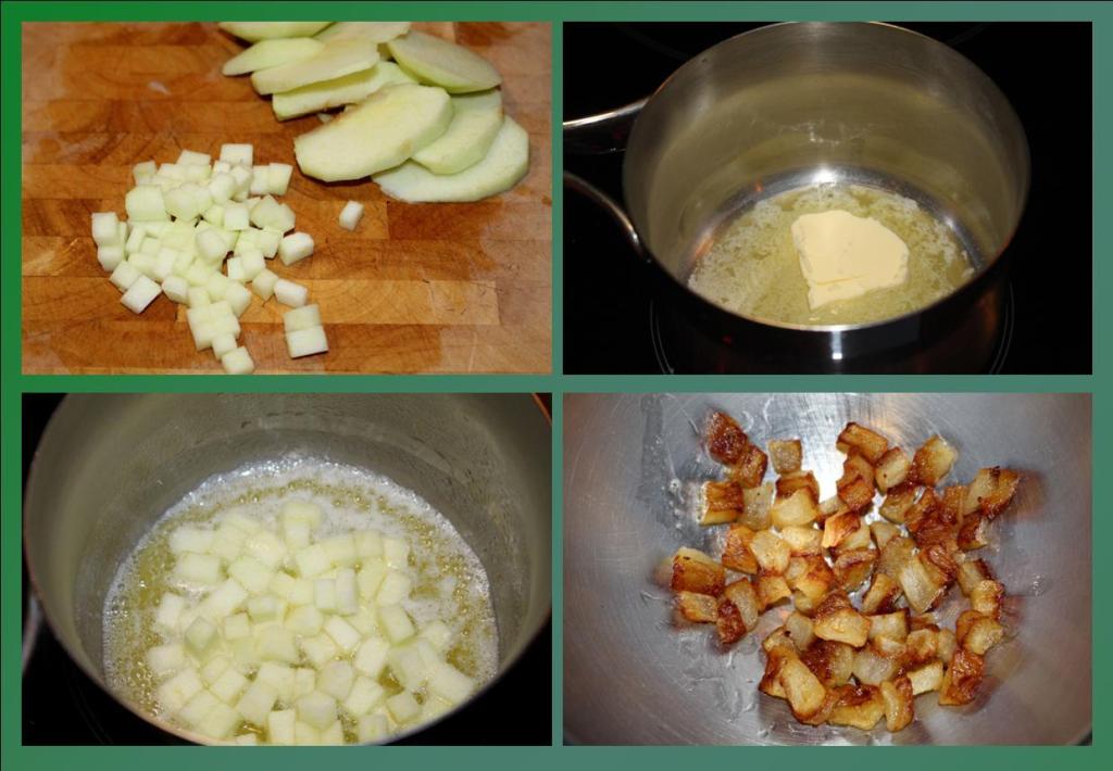 Por último cortaremos unos mini dados de manzana y les daremos color en una cacerola con un poco de mantequilla fundida. Escurrimos el líquido y reservamos los trozos para la decoración final.