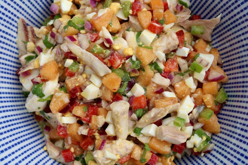 Cortamos todas las verduras, los nísperos y los huevos en una fina brunoise. Creo que uno de los éxitos de un buen salpicón es encontrarnos con una uniformidad razonable en todos sus ingredientes a excepción del ingrediente principal.