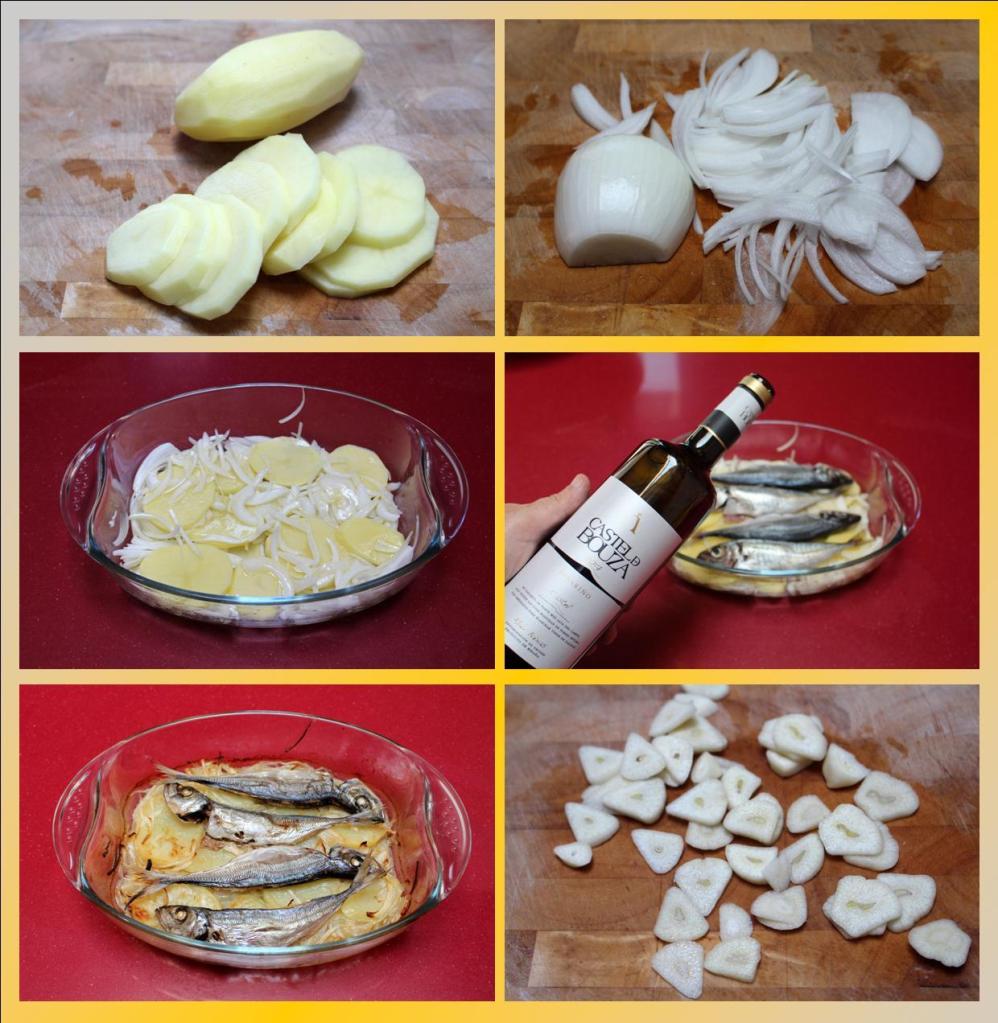 Pelamos la patata y cebolla, cortamos la primera en rodajas no muy gruesas y la cebolla en juliana. Ponemos en un recipiente apto para horno salando y embadurnando de aceite y sobre este lecho el pescado. Regamos con el vino e introducimos al horno precalentado a 180 durante 20 minutos.