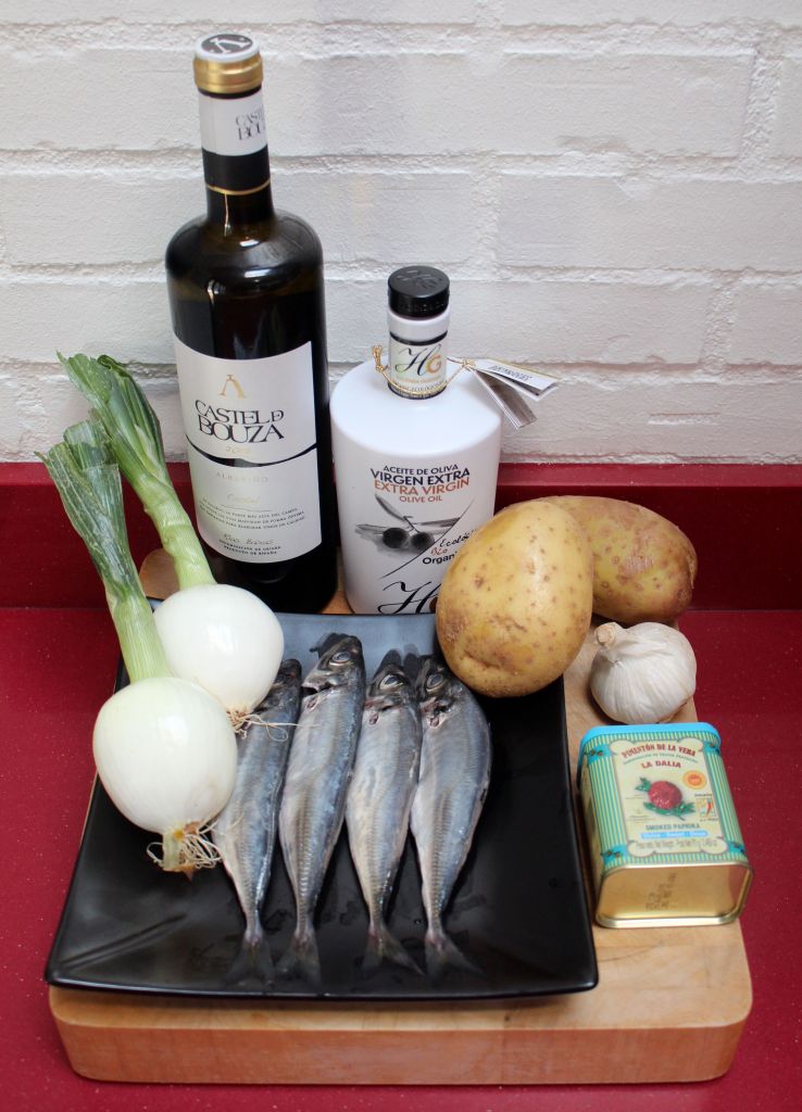 Chicharro (jurel), 1 patata, 1 cebolleta, 2 dientes de ajo, 1 buen chorro de vino albariño, AOVE, 1 cda de pimentón dulce y sal.