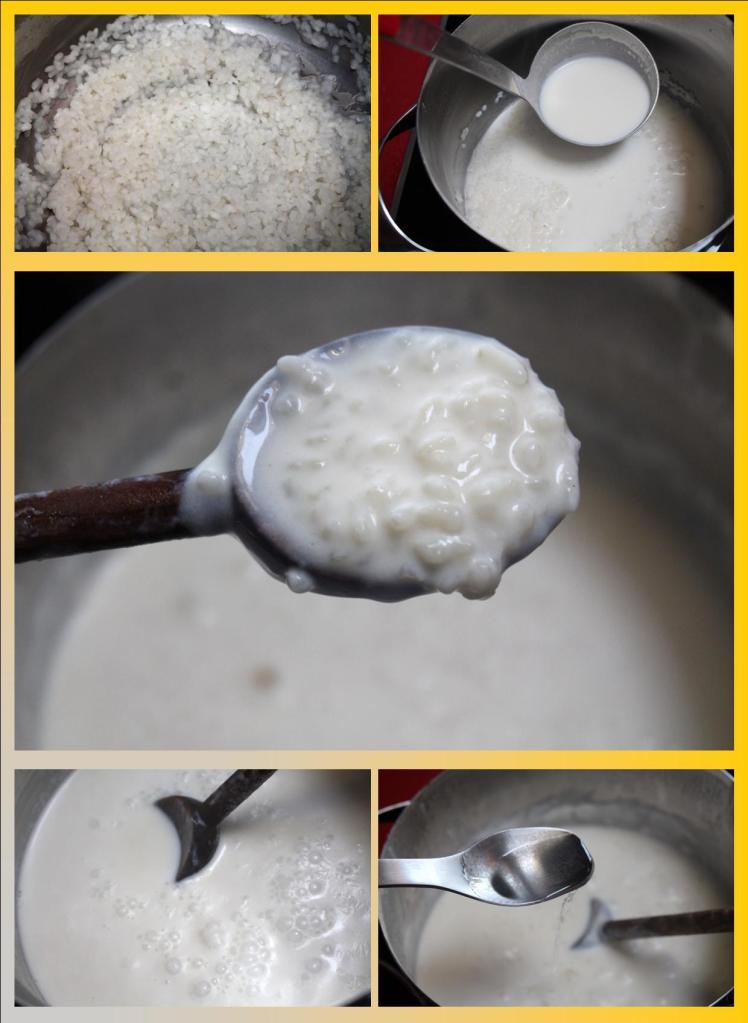 Añadimos la mitad de la leche infusionada y con una cuchara de madera vamos removiendo de vez en cuando, es muy importante que no se agarre al fondo. Poco a poco a fuego medio, al chup chup, el arroz irá engordando y absorbiendo la leche. Cuando veáis que aún estando líquido la leche ha menguado, vamos añadiendo el resto de leche. Seguimos revolviendo, hay que estar muy vigilante, nada de irse a ver la tele.