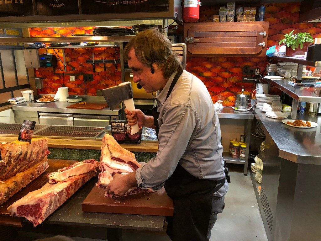 Mientras la parrilla cogía fuerza, a machetazos Imanol iba seleccionando las piezas que más o menos rondaban o superaban el kilo. Nos hablaba de unos 350grs por persona si la comida era acompañada de unos entrantes, pero ante esa calidad yo no me distraería y el kilo lo asumo con facilidad.