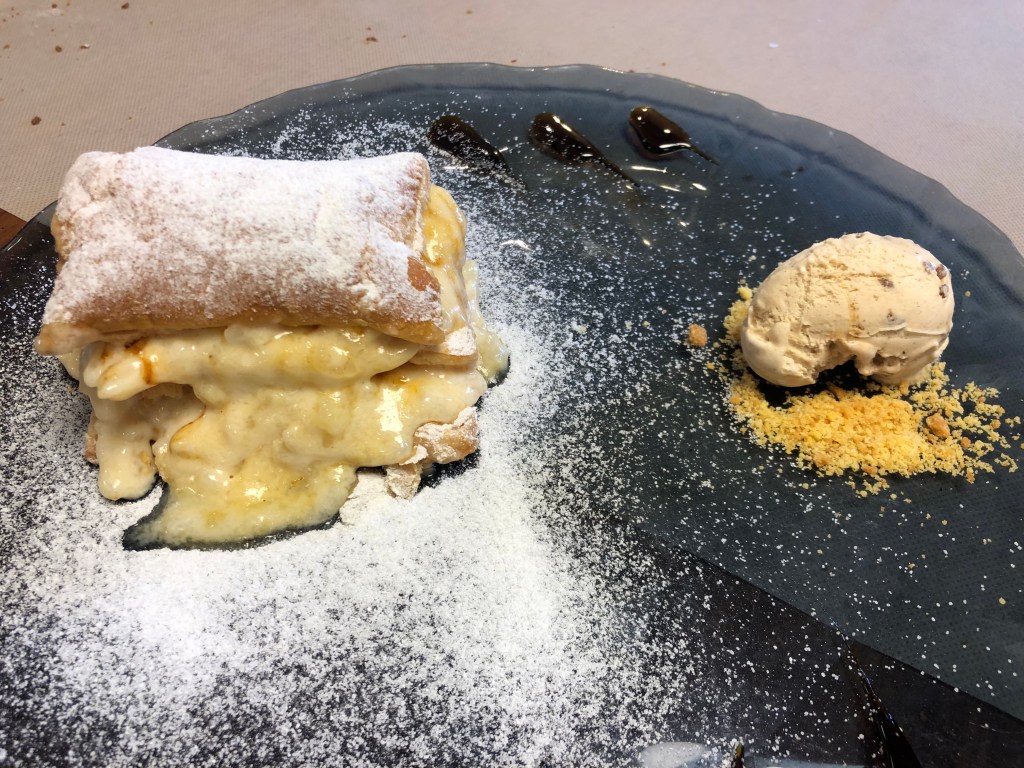 Para los postres elegimos el milhojas de hojaldre horneado al momento, relleno de arroz con leche requemado y acompañado de helado de canela casero que obviamente repetimos en la nueva visita.