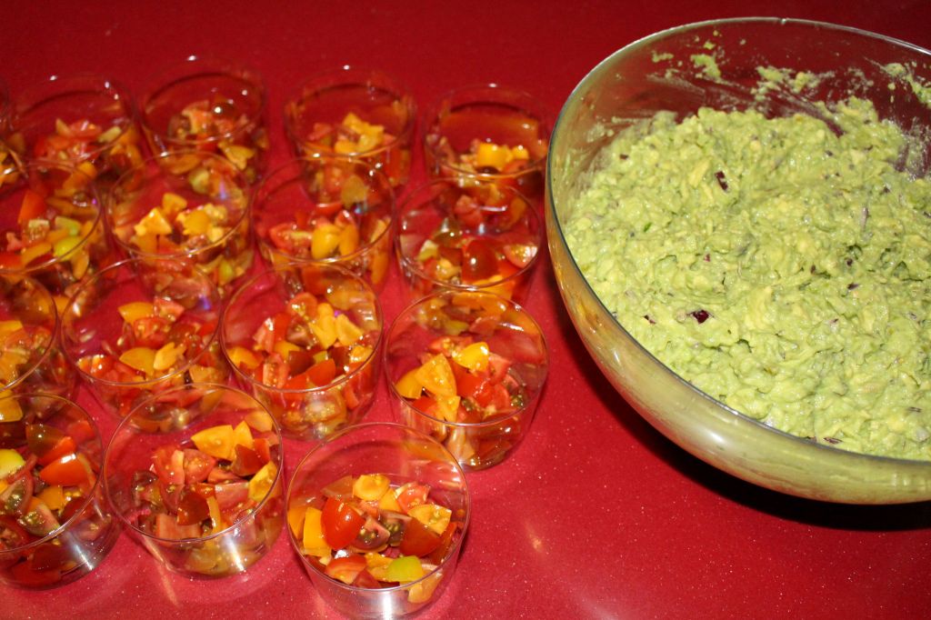 En el caso del salmón, quise preparar unos vasitos con un mix de tomates cherry, guacamole casero, canónigos y salmón. Siendo tantos, lo más práctico era poder sacar unos dados del lomo y comprar un salmón entero me pareció la mejor opción.